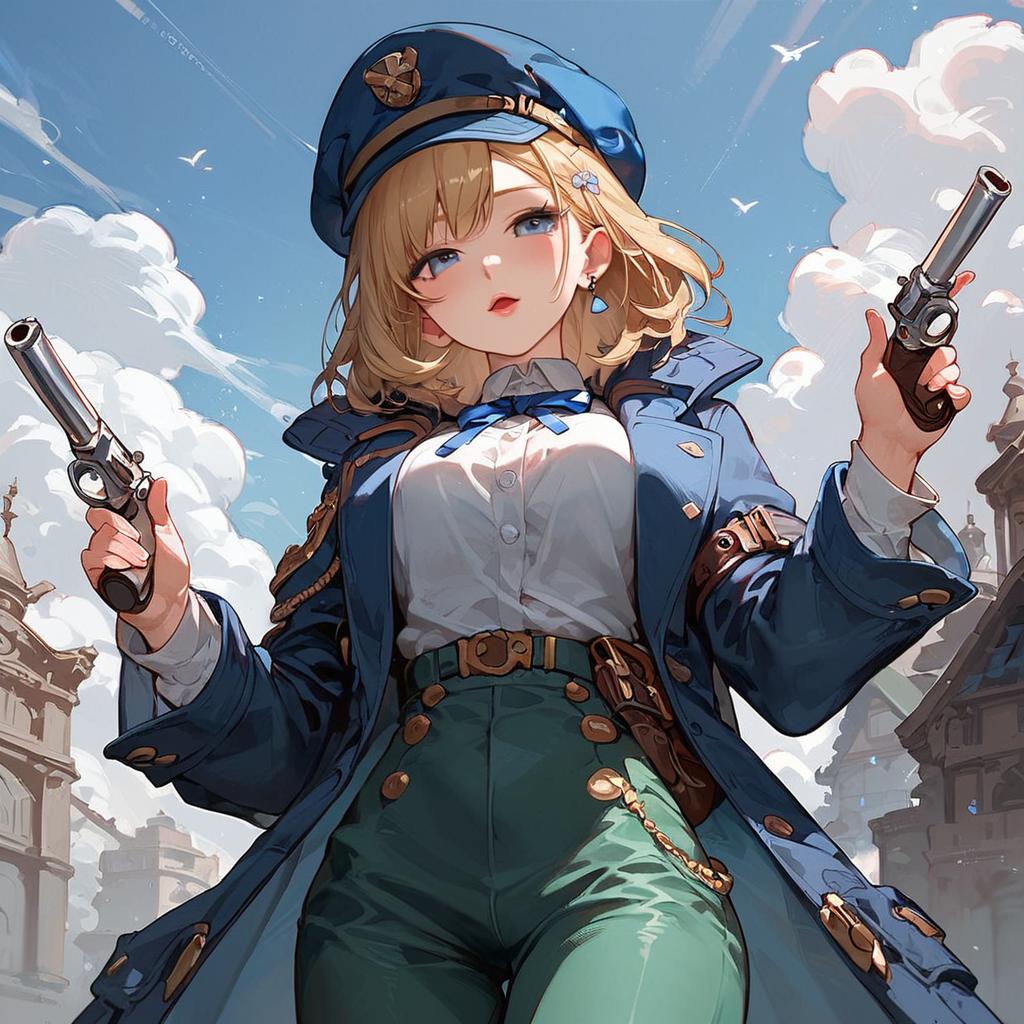 Score_9, score_8_up, score_7_up, source_anime, solo, 1girl, naotodetective, expressionless, looking at viewer, holding gun, holding revolver, cabbie hat, blue coat, buttons, neck ribbon, long sleeves, green pants, plaid, outdoors