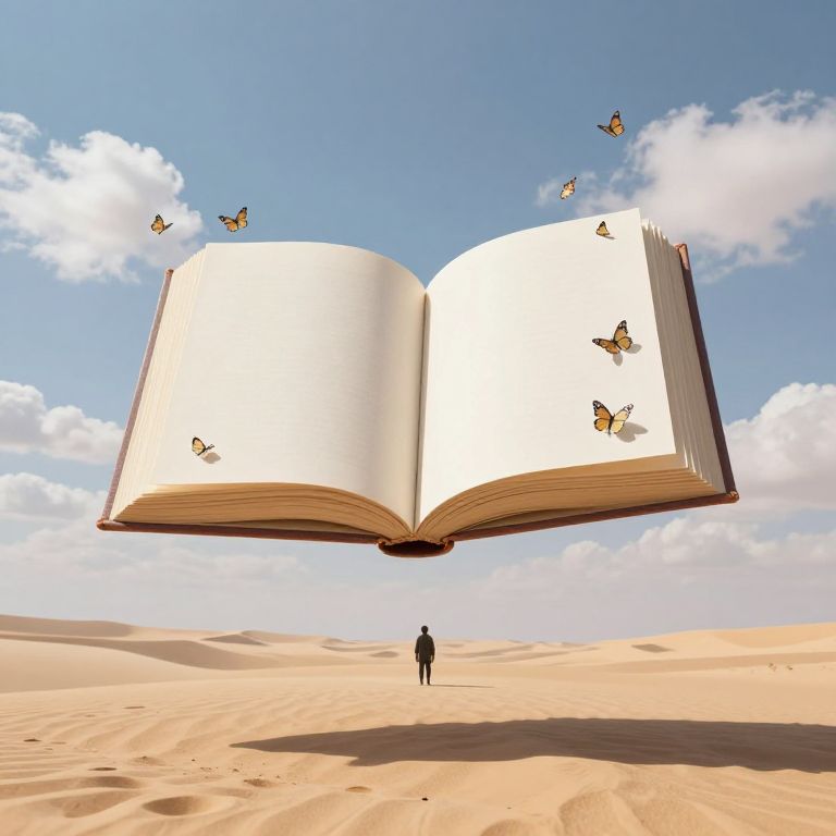 Giant open book suspended in midair, its blank pages surrounded by delicate butterflies, casts a shadow over a solitary figure standing in a vast desert landscape beneath a serene sky dotted with fluffy clouds.