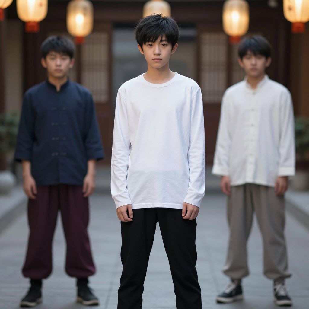 Photograph of three young Asian boys standing in a traditional Japanese courtyard at night. The central boy, with straight black hair and a serious expression, wears a white long-sleeve shirt and black pants. Flanking him are two boys; the left one wears a black long-sleeve shirt and dark pants, while the right one wears a white long-sleeve shirt and grey pants. Warm, glowing lanterns hang in the background, illuminating the wooden building with a traditional Japanese architectural style. The stone-paved ground adds texture to the scene. The boys stand with a slight forward lean, creating a sense of focus and symmetry.