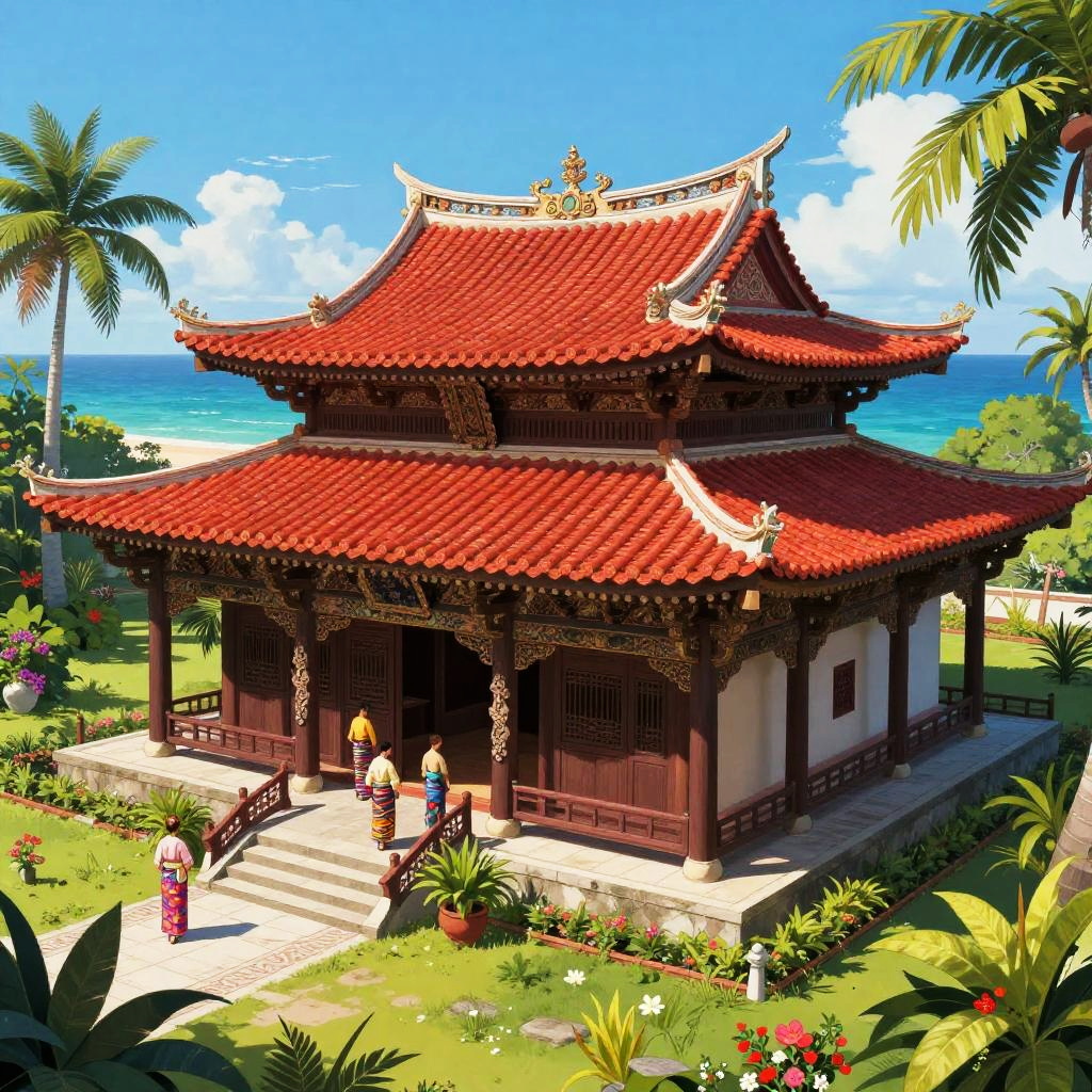 Ryukyu kingdom traditional palace with vibrant Okinawan red tiled roofs, lush tropical gardens surrounding, azure ocean backdrop under bright blue sky, intricate wooden carvings and colorful cultural attire, detailed and vibrant digital art.