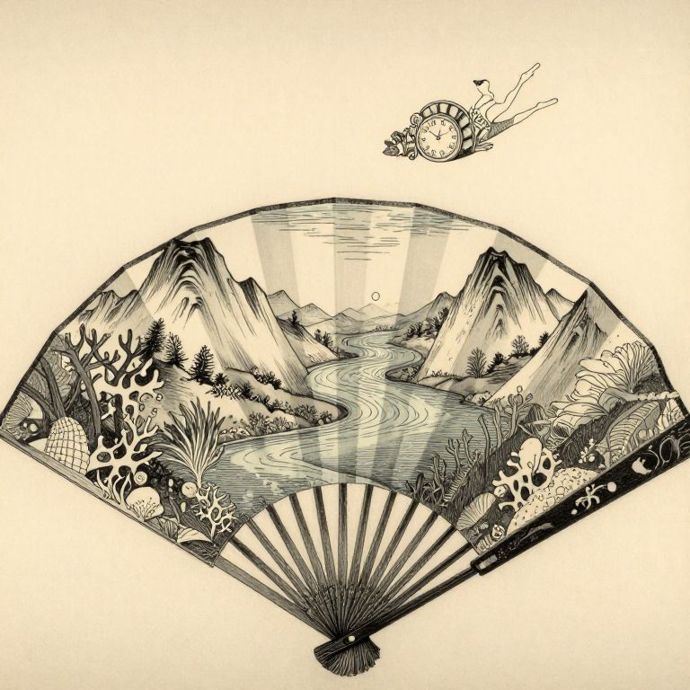 This detailed black-and-white ink drawing features a hand fan as a frame, opening outward to reveal an intricate, nature-filled landscape. The fan's edges are decorated with patterns of seashells, coral, and leaves. Inside the fan, a winding river flows through a valley surrounded by lush vegetation, including palm trees and bushes. Majestic, stylized mountains rise in the background, with sunlight streaming down from the top center. A fish with detailed scales and fins hovers in the upper right, adding a whimsical touch. The fan's texture is emphasized with fine lines, giving it a realistic feel.