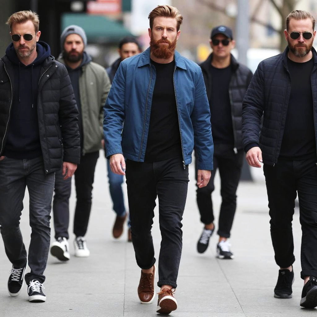 A bearded man wearing a blue jacket and black shirt walks confidently down a city street, surrounded by other men dressed in casual streetwear. The image captures an urban, modern street style with a focus on masculine fashion and natural lighting.