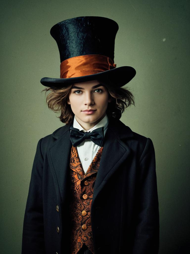 Alice wonderland costume mad, solo, hat, 1boy, male focus, top hat, brown hair, bow, smile, realistic, looking at viewer, bowtie