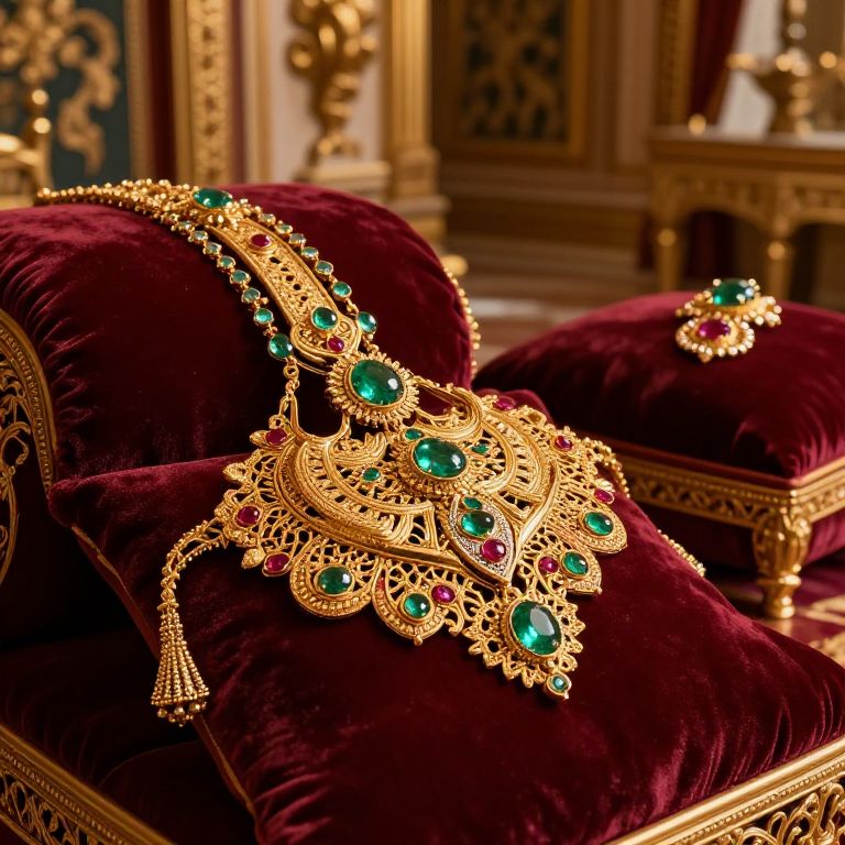 Regal jewelry sparkling under soft light, intricate gold filigree designs with embedded emeralds and rubies, set on velvet cushions in an ornate royal chamber, detailed textures and rich vibrant colors with a majestic atmosphere
