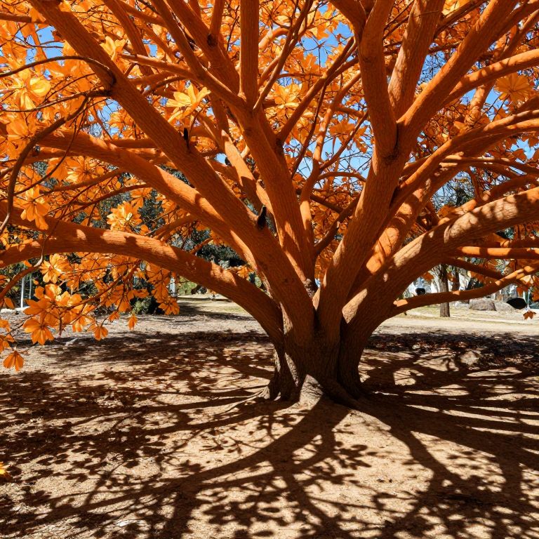 Towering orange tree branches radiate liquid light, casting intricate shadows that bloom into ephemeral flowers upon touching the earthy ground below.