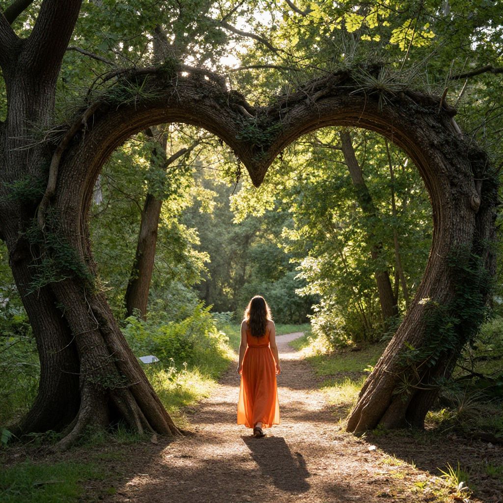 Sunlight filters through a heart-shaped arch formed by two ancient trees, casting a warm glow as a woman in a flowing orange dress walks away down a serene forest path surrounded by lush greenery.