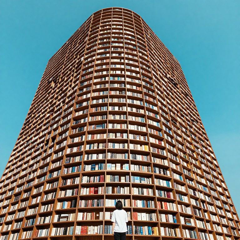A towering, endless library of stacked bookshelves ascends into the azure sky, defying gravity and convention, as a solitary figure stands in awe beneath its surreal, infinite expanse.