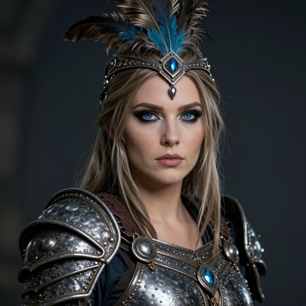 A woman with blue eyes and feathered headpiece, wearing a warrior's armor.