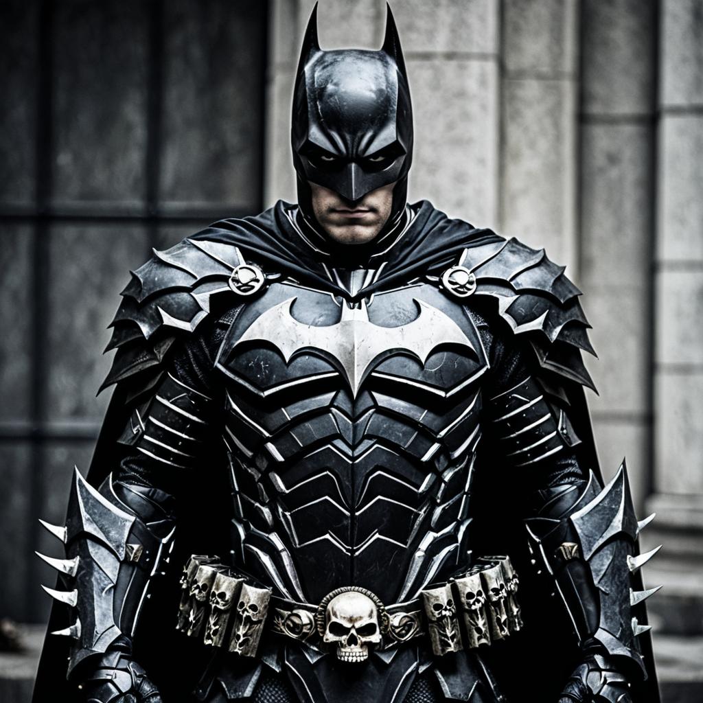 Batman The Merciless, cosplay of a demonic knight in black jagged armor and skull motifs costume