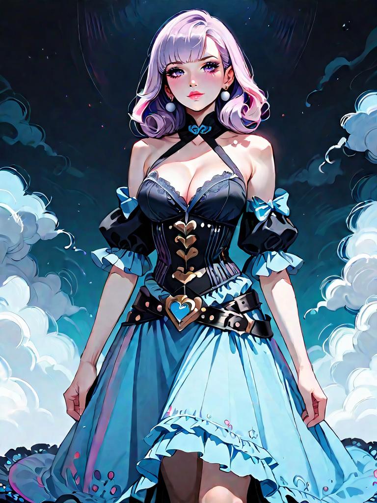 Digital artwork of a full-body dark fantasy girl standing at night surrounded by fog and mist. She has lilac hair styled in waves and wears a black velvet corset-style halter dress with a fitted bodice, intricate lace overlay, sweetheart neckline, and cascading blue tulle skirt with layered ruffles. The outfit is accessorized with a satin ribbon belt, heart-shaped embellishment, and pearl drop earrings.
