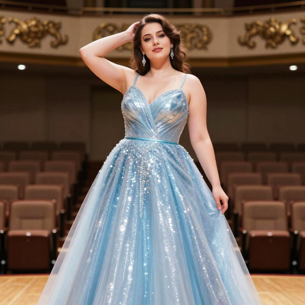 A curvy woman wearing a shimmering ice blue ball gown with a V-neckline and thin straps poses gracefully in a concert hall. The dress features a cinched waist and an expansive A-line skirt with sequin details. She accessorizes with drop earrings and has styled wavy brown hair, standing on a wooden stage with empty brown seats in the background.