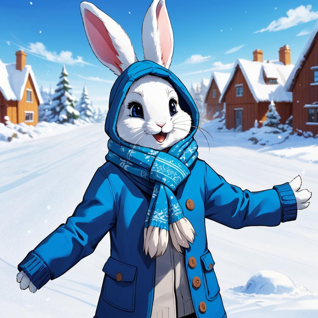 Anthropomorphic rabbit standing outdoors in a snowy landscape under a clear blue sky, dressed in a blue winter jacket with hood, a matching blue scarf with red and white stripes, and white gloves. The rabbit has long ears, black eyes, and a furry face with a slight smile, showcasing a winter theme in a forested area.