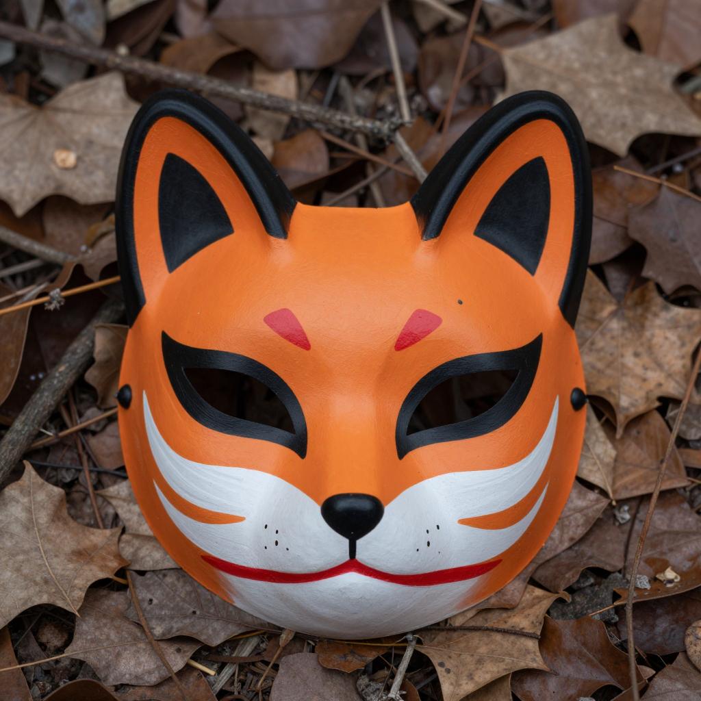 Painted fox mask on forest floor. Mask has orange and black colors, swirling black ear designs, red triangular eyes, and a red mouth with sharp teeth. Surrounding leaves are brown and dry. Mask is centered in the image.