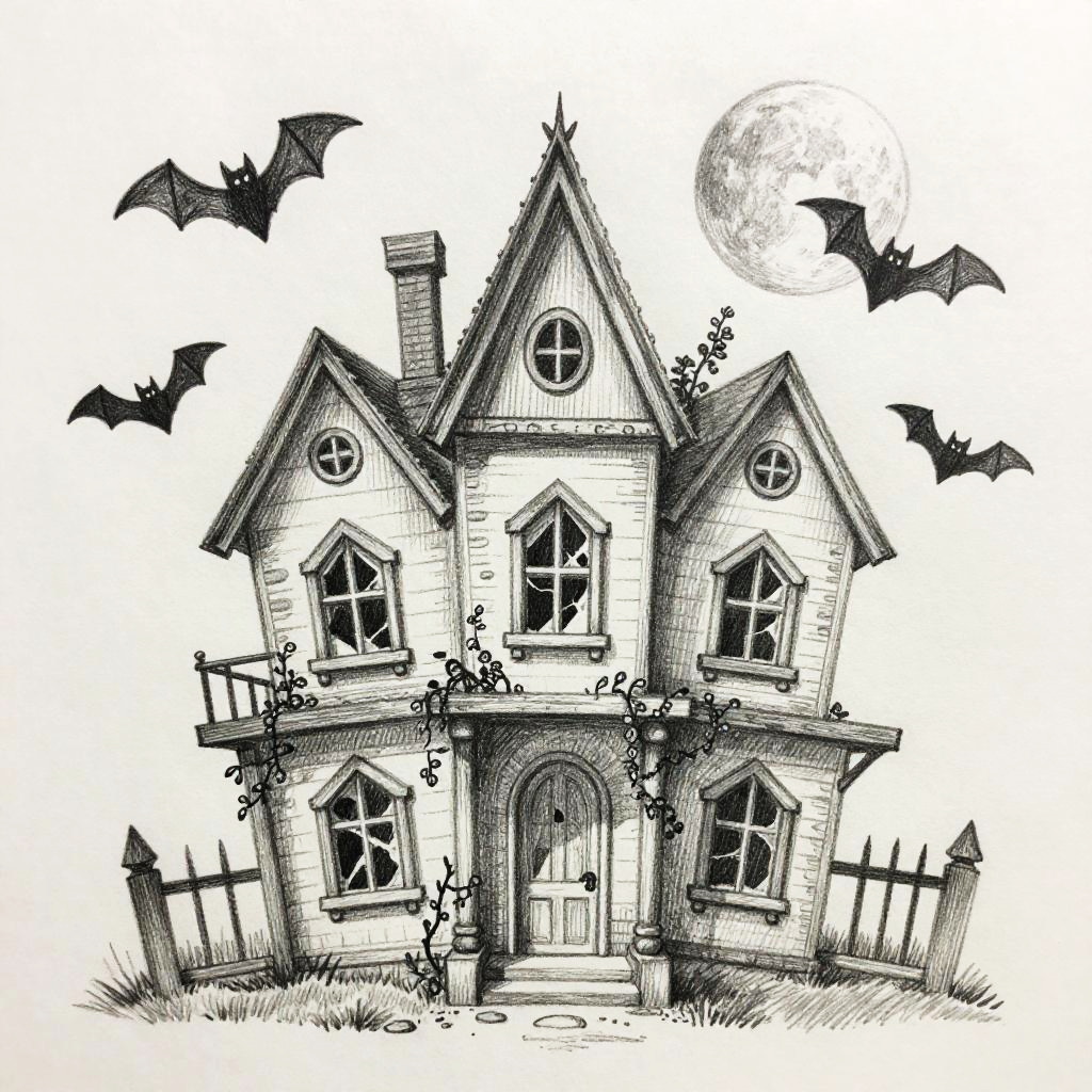 Pencil easy scary drawings of haunted old houses with broken windows and overgrown vines, bats flying around under a full moon, simple yet striking pencil strokes emphasizing spooky details and suspenseful moods.