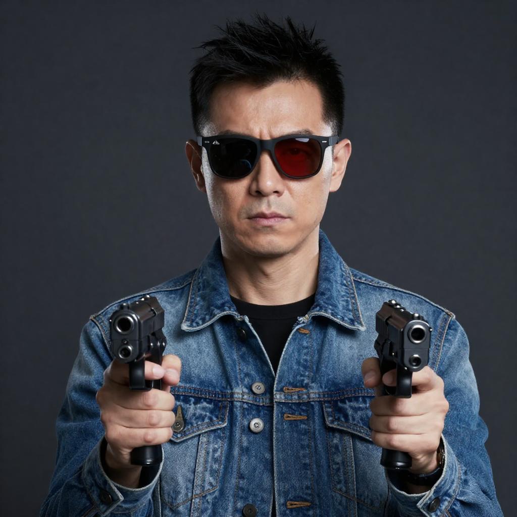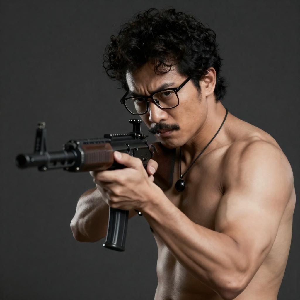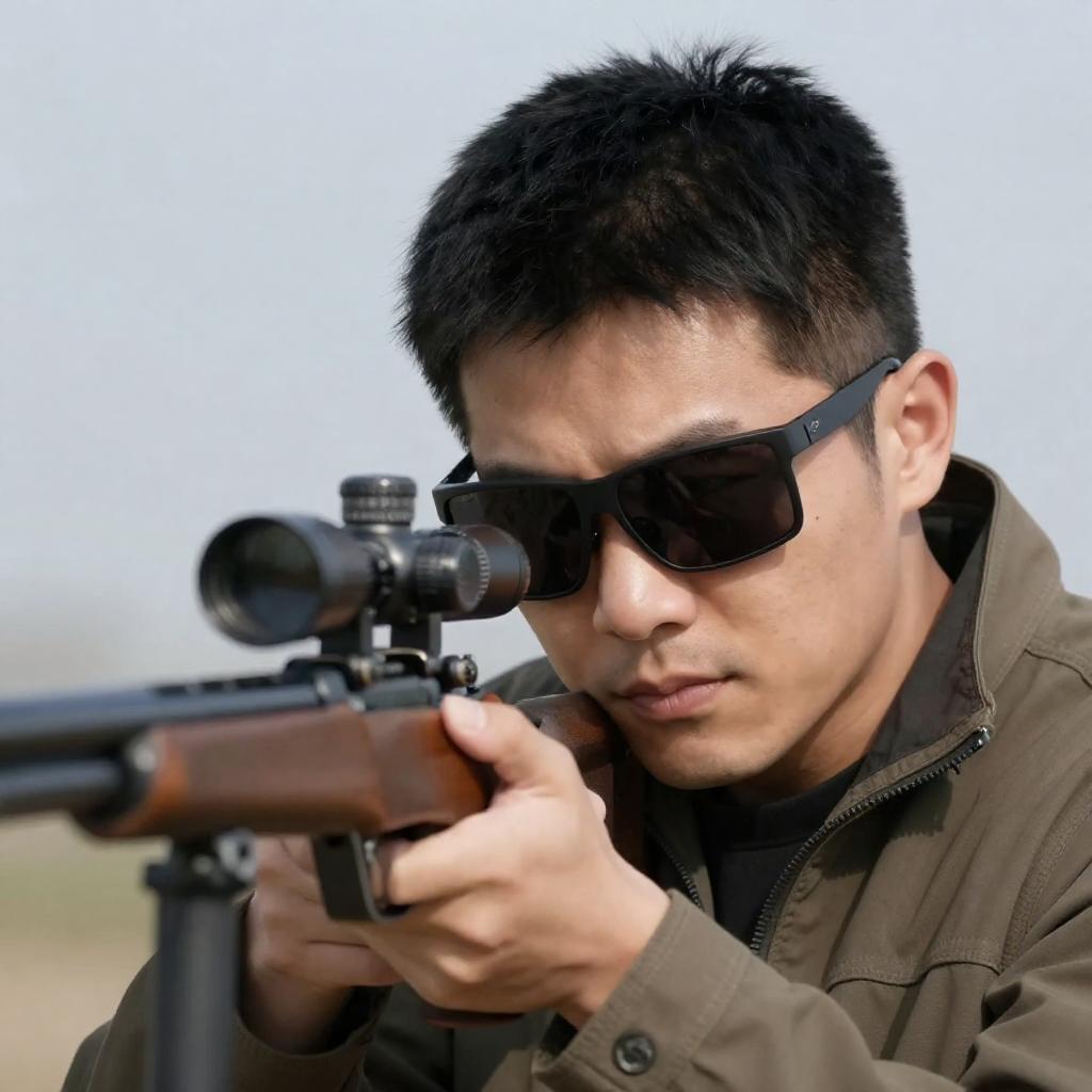 Photograph of a man with dark hair, wearing black sunglasses, aiming a rifle with a scope. He holds the rifle with his right hand, wearing a brown jacket. Blue-gray background. Intense focus on the rifle's scope. Close-up shot.