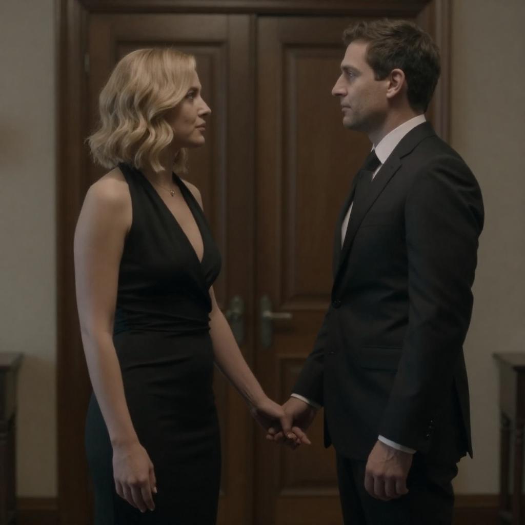 Photograph of a man in a dark suit, white shirt, and tie, with a boutonnière, standing with arms outstretched in a hallway. A woman with blonde hair in a black top and skirt, black stockings, and black heels sits on the floor with legs extended. The hallway has beige walls, framed art, and a table with a vase of flowers. Door is open behind the man. Man's facial expression is intense, woman's face is not visible.