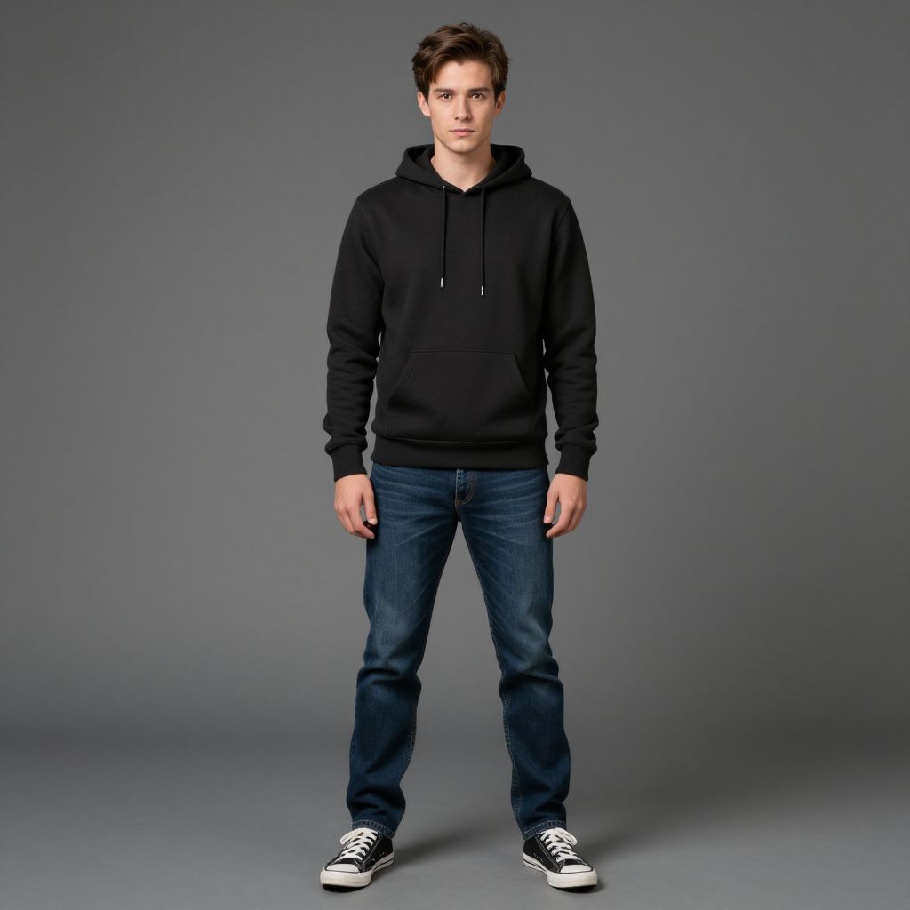 Photograph of a young Caucasian man standing against a plain gray background. He has short, dark brown hair and a neutral expression. He is wearing a black hooded sweatshirt with drawstrings, dark blue jeans, and black and white sneakers. The lighting is even, highlighting his casual attire. His stance is relaxed, with arms slightly away from his body and feet shoulder-width apart. The overall style is simple and contemporary.
