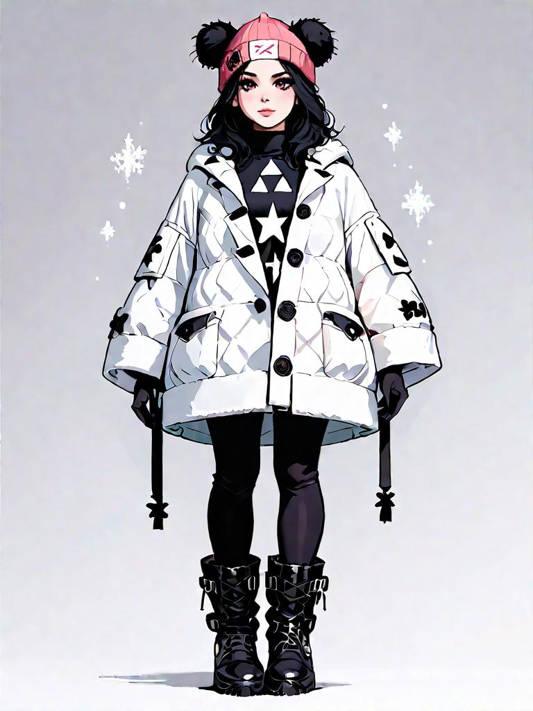 1girl, source_comics, realistic face, full body shot, Woman, winter chic, oversized black down puffer coat, mid-calf length, wide horizontal quilting, large puffed collar, cuffed sleeves, white knitted sweater with central black star motif, A-line black midi skirt, opaque black leggings, chunky black boots with ridged soles, black gloves, pink beanie, studio background.