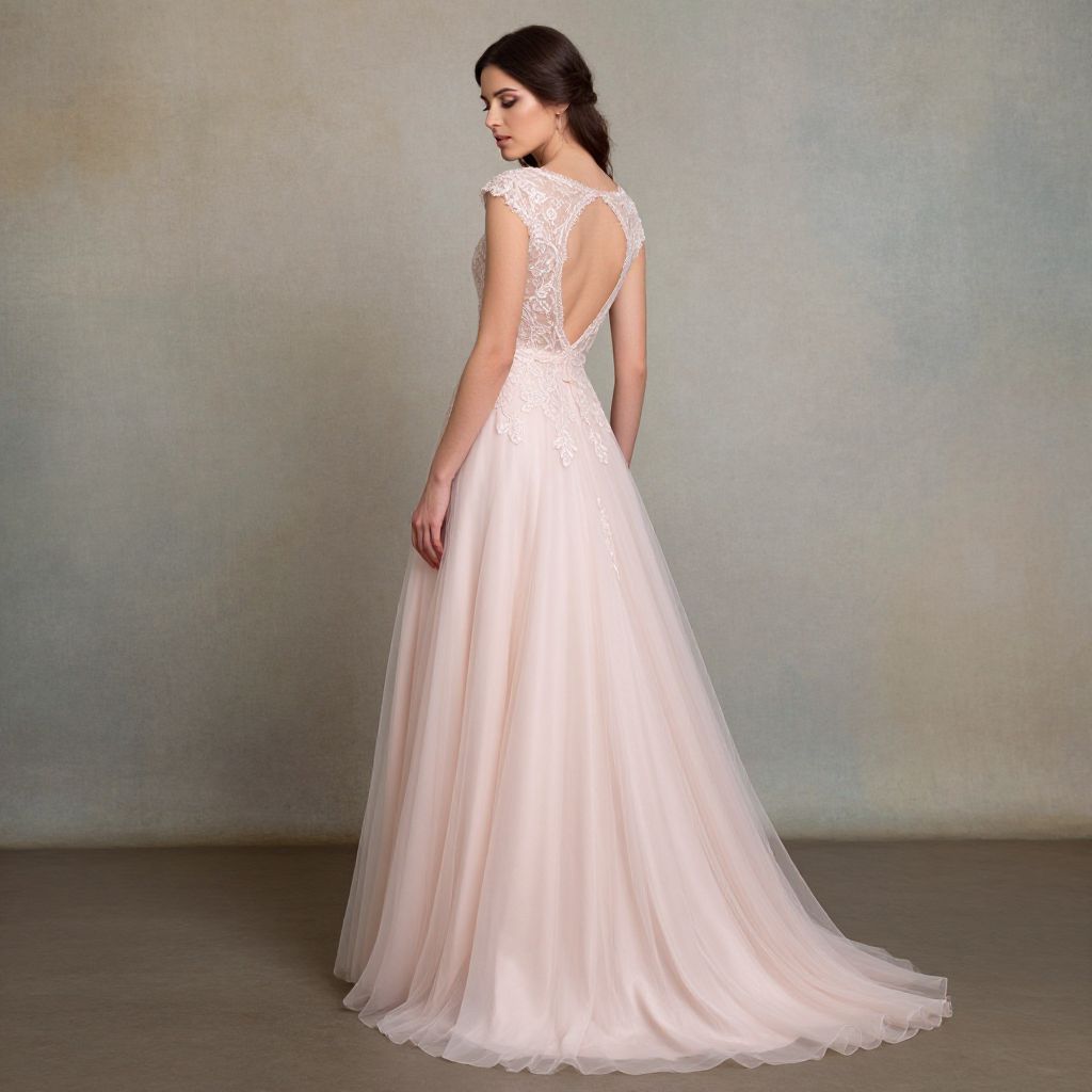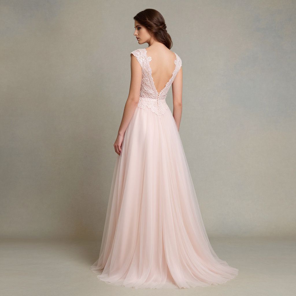 A woman stands elegantly in a light pink tulle long prom dress, featuring intricate lace detailing on the back and a flowing skirt, set against a vintage-inspired backdrop with soft, pastel tones and subtle lighting effects, creating a timeless and romantic atmosphere.