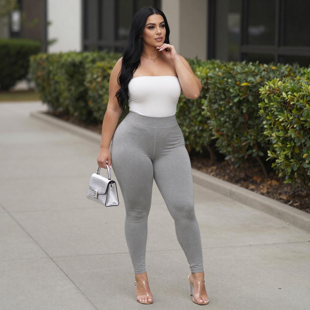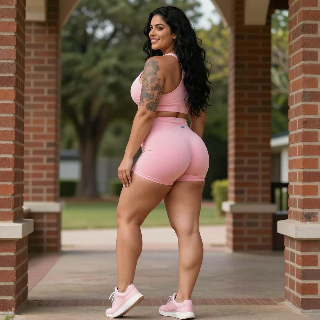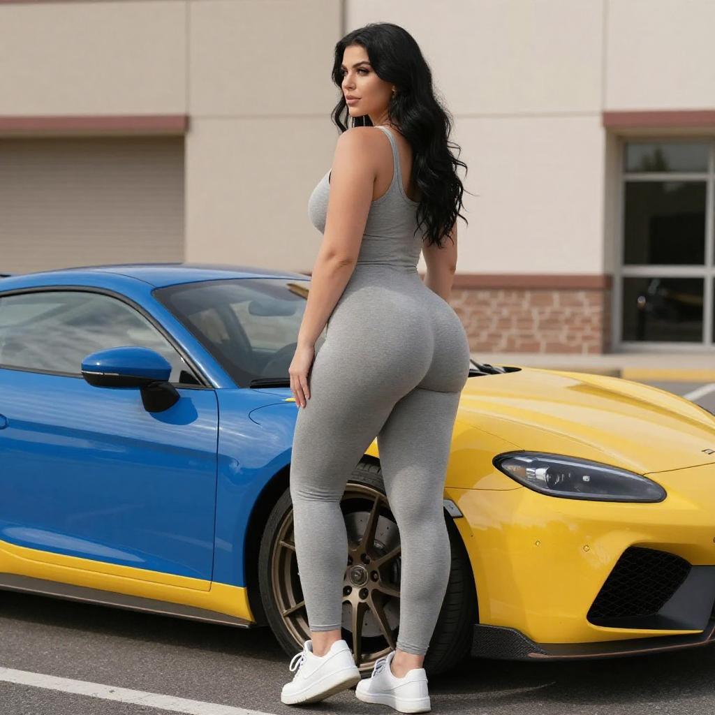 Photograph of a curvy woman with long black hair, wearing a tight gray bodysuit and white sneakers, standing beside a blue and yellow sports car in a parking lot. She looks over her shoulder, highlighting her prominent buttocks. The car's glossy surface reflects sunlight, and a building with beige tiles is in the background.