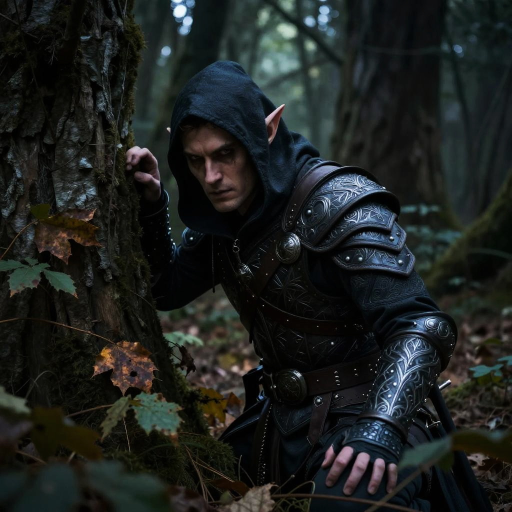 Realistic photo.sneaky elven rogue, wearing dark leather armor with intricate silver patterns, hiding in the shadows, enchanted forest, tense atmosphere with rustling leaves and distant whispers. realistic photo