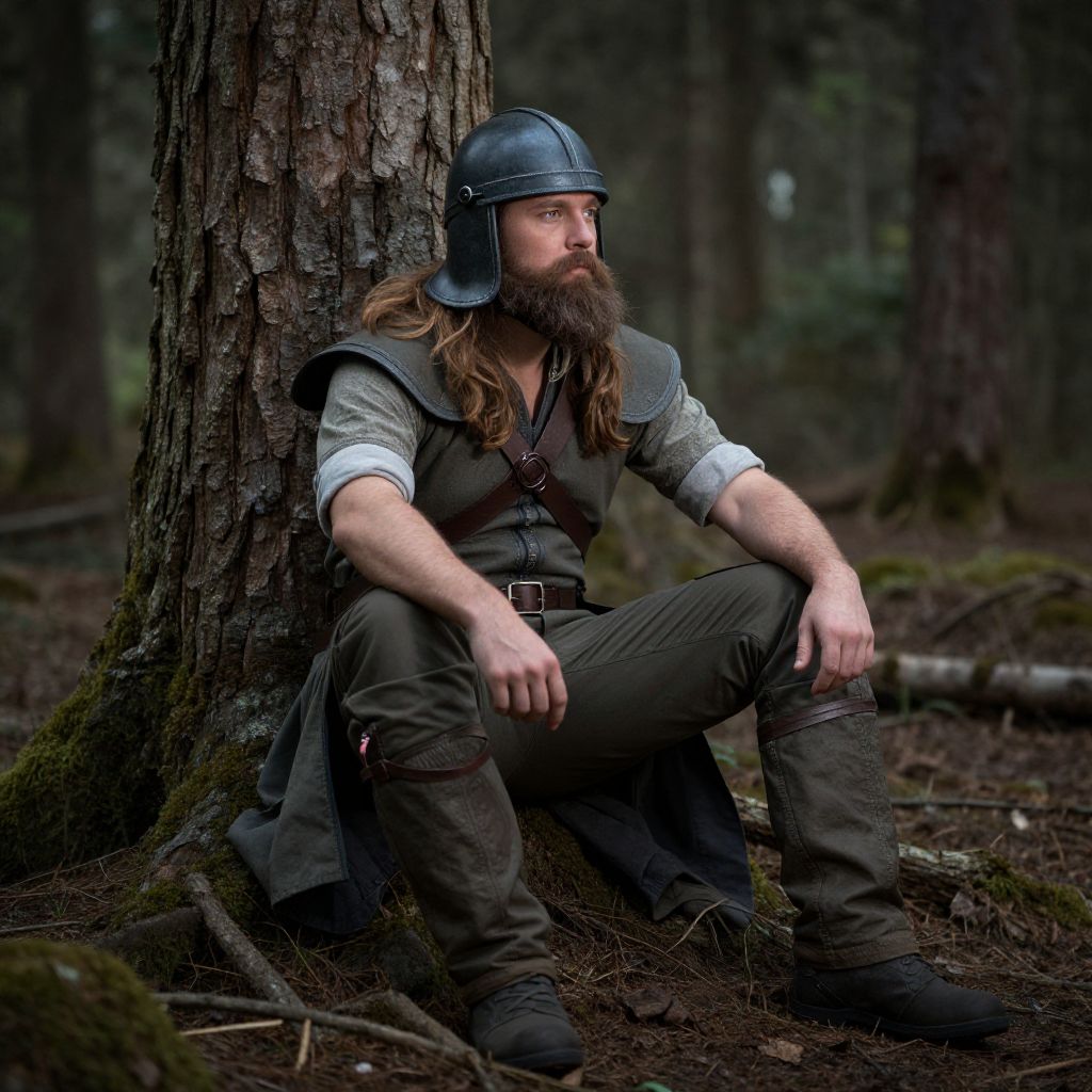Photograph of a bearded man with long brown hair, wearing a black medieval-style helmet, grey long-sleeve shirt, dark vest, and dark pants with brown boots. He is sitting against a tall tree in a dense forest, leaning slightly forward with his arms resting on his knees. The background is blurred, featuring tall trees and dark, moss-covered forest floor. The man's expression is serious, and the lighting is natural, highlighting the texture of the tree bark and his rugged attire. The overall mood is medieval and adventurous.