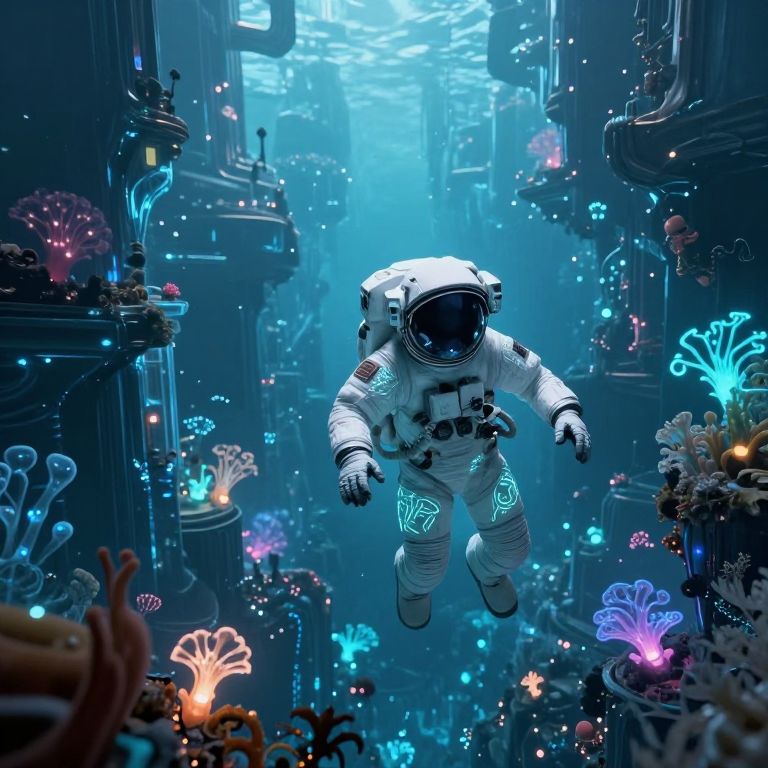 In this mesmerizing, hyper-realistic underwater cityscape, ethereal bioluminescent flora and fauna cast an otherworldly glow on crystalline structures defying gravity. A lone astronaut clad in an advanced deep-sea diving suit adorned with intricate, glowing patterns explores the enigmatic city from a bird's eye view. The astronaut's face is obscured by their helmet yet their silhouette conveys a sense of wonder and discovery reminiscent of dreamlike qualities found in surreal art combined with photorealistic details capturing both awe-inspiring beauty and unsettling mysteries that lie beneath the waves.