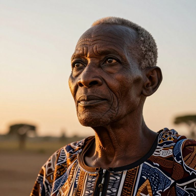 A photorealistic portrait photograph captures an African elder with deep creases adorning their face, symbolizing a life filled with wisdom and experience. Their warm eyes, exuding knowledge, hold an enigmatic gaze as they contemplate the horizon from a unique worm's-eye perspective. The soft golden light of dusk envelops the scene, casting long shadows that accentuate the rugged texture of their weathered skin while highlighting the intricate patterns on their traditional African garment. This image embodies tranquility and mystery, inviting viewers to explore the complexities of this soul who has witnessed countless seasons.