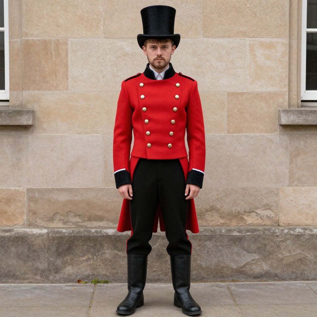 Photograph of a young man in a bright red military-style coat with gold buttons, black pants, tall black top hat, and black boots, standing