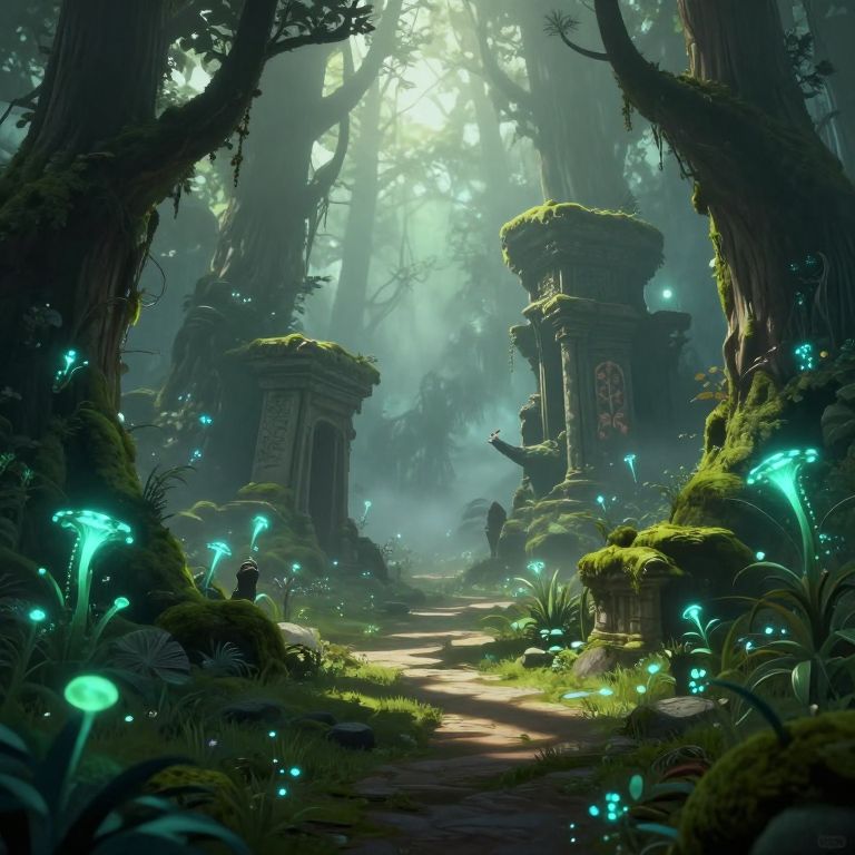 A mystical forest scene featuring glowing bioluminescent plants scattered along a moss-covered pathway. Ancient ruins with intricate carvings stand partially overgrown with moss, surrounded by tall trees and subtle fog. Soft ethereal lighting creates long shadows, enhancing the magical and tranquil atmosphere. Enchanted creatures can be seen peeking through the mist, emphasizing the fantasy concept art style.