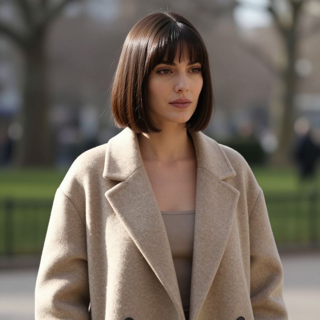 Woman with tapered shoulder cut hairstyle standing in a sunlit urban park, natural sunlight streaming through trees, wearing a neutral-toned woven scarf, soft focus background, realistic skin texture, cinematic lighting, medium composition, 4K detail.