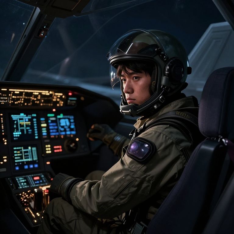 Anime fighter pilot preparing for launch inside advanced fighter jet, illuminated control panels, intense concentration, detailed suit and helmet, realistic reflections, moody lighting