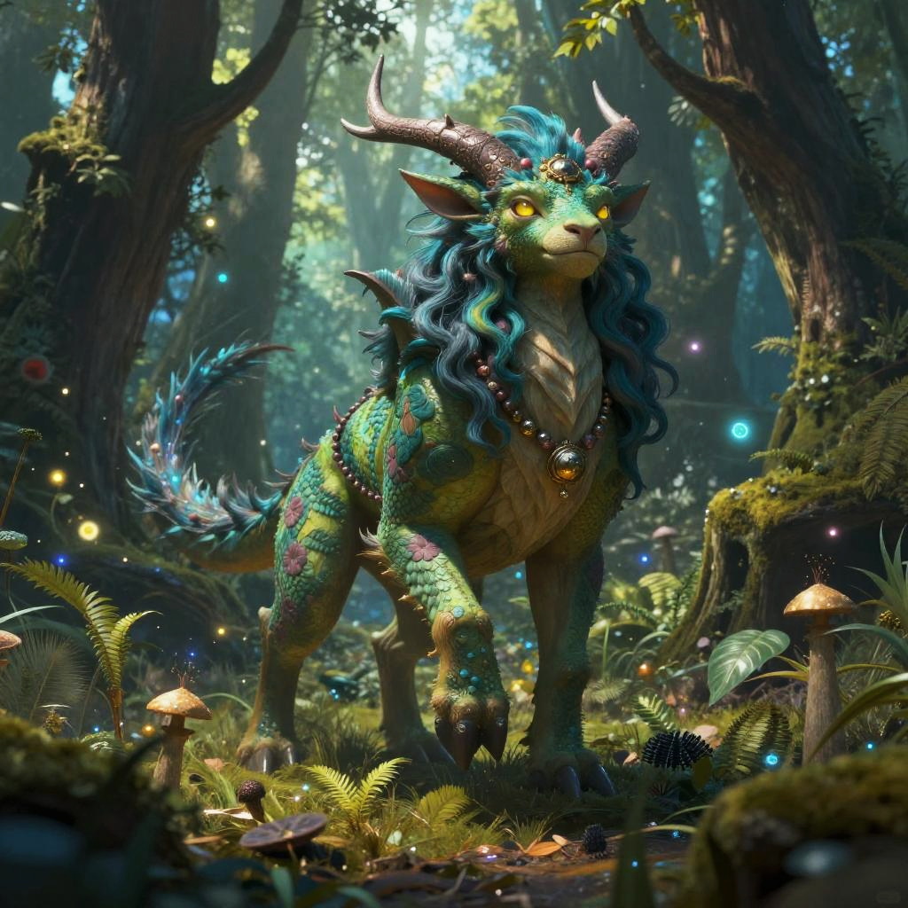 Art image portraying a fantasy creature emerging from an enchanted forest, rendered in vibrant colors and fine detail, combining elements of mythical beasts and nature, illuminated by mystical glowing particles in a mysterious ambiance.