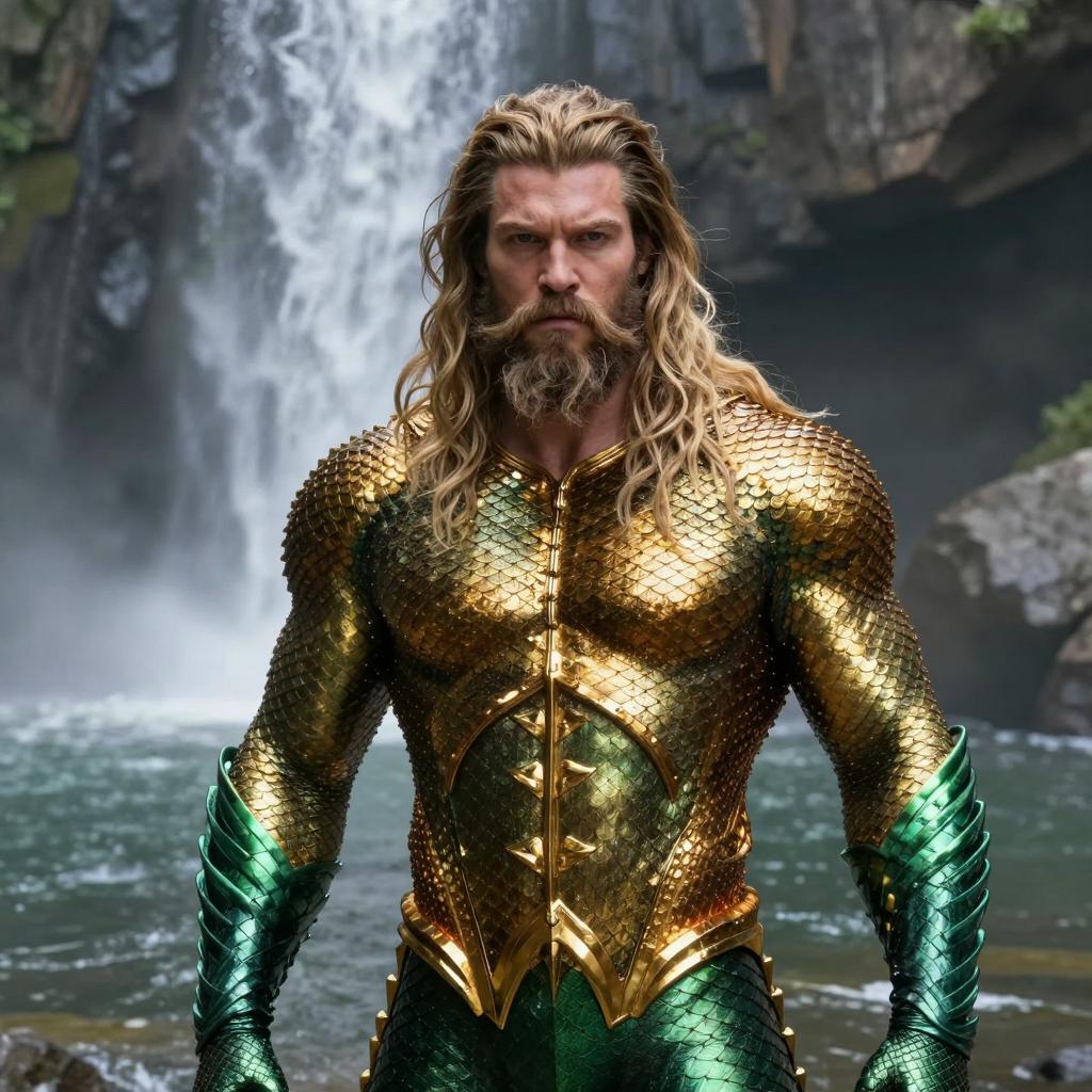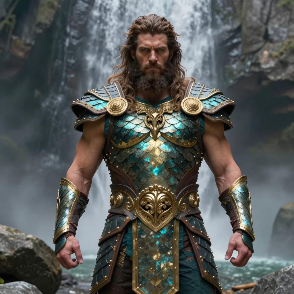 Cosplay poseidon costume, digital art, muscular man with long brown hair and beard, fantasy armor, teal and gold color scheme, detailed scales on chest, strong jawline, serious expression, standing in rocky, mountainous landscape with waterfall, CGI style, epic fantasy, highly detailed ures, dramatic lighting, strong contrast, imposing presence