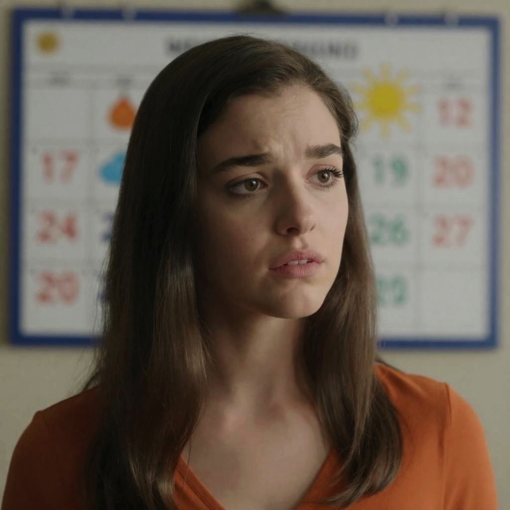 Young woman with brown, shoulder-length hair, wearing a beige turtleneck and gray tunic, looking through vertical metal bars. Dimly lit background. Intense expression on her face. Single person. Photographic image.