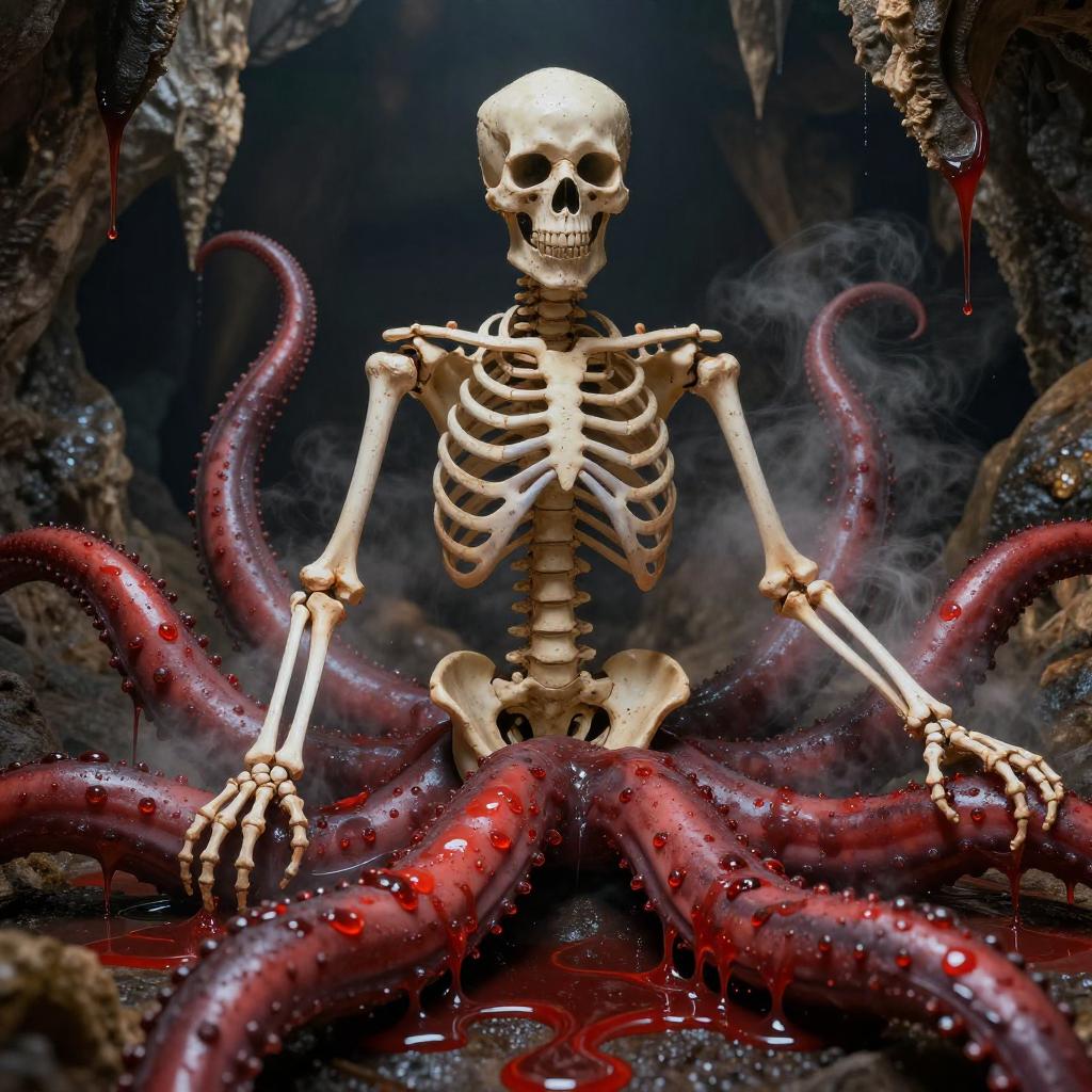 (best quality, masterpiece, realistic), human skeleton, red tentacle cave background, liquid acid puddle, wet, dripping, steam