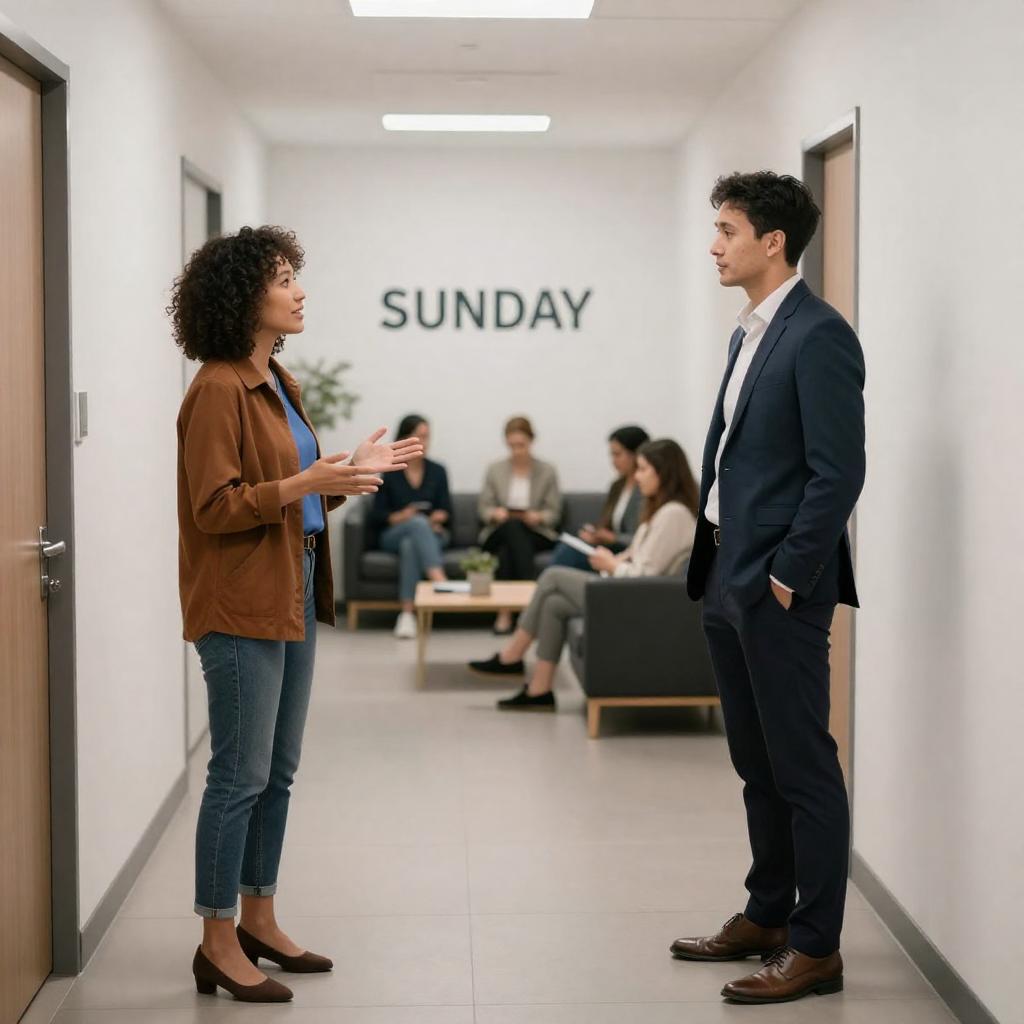 Photograph of a modern office hallway with white walls and bright overhead lighting. A curly-haired African-American woman with a medium build, wearing a brown blazer, blue shirt, and jeans, stands on the left, gesturing with her hands. Facing her is an Asian man with short black hair, a medium build, dressed in a black suit, white shirt, and brown shoes. In the blurred background, four seated individuals of diverse ethnicities sit on black sofas, with the word "SUNDAY" in bold black letters on the wall behind them. The floor is light gray, and wooden doors frame the hallway.