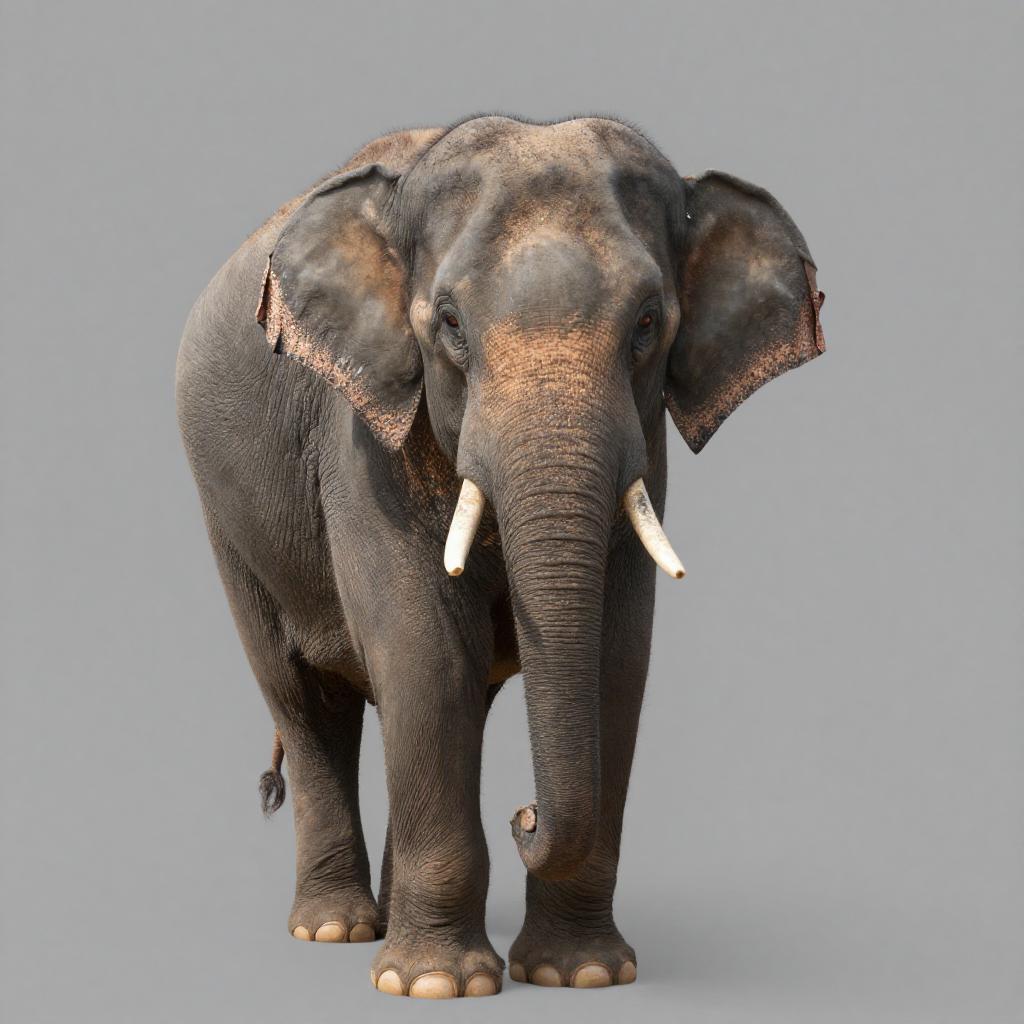 Full body, solo, animal_focus, elephant, gentle brown eyes, closed mouth, smile, looking at viewer, realistic, grey background