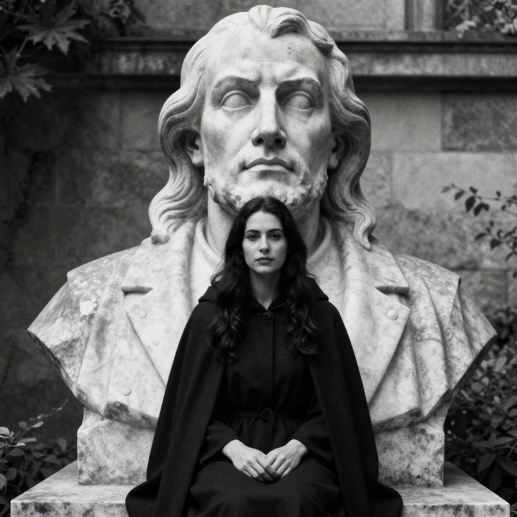 Black-and-white photograph of a young woman with long dark hair wearing a dark cloak, sitting calmly at the base of a large carved marble bust of an old man with wavy hair and a serious expression. The statue dominates the background against a stone wall with foliage around. The image exudes a moody, contemplative atmosphere.