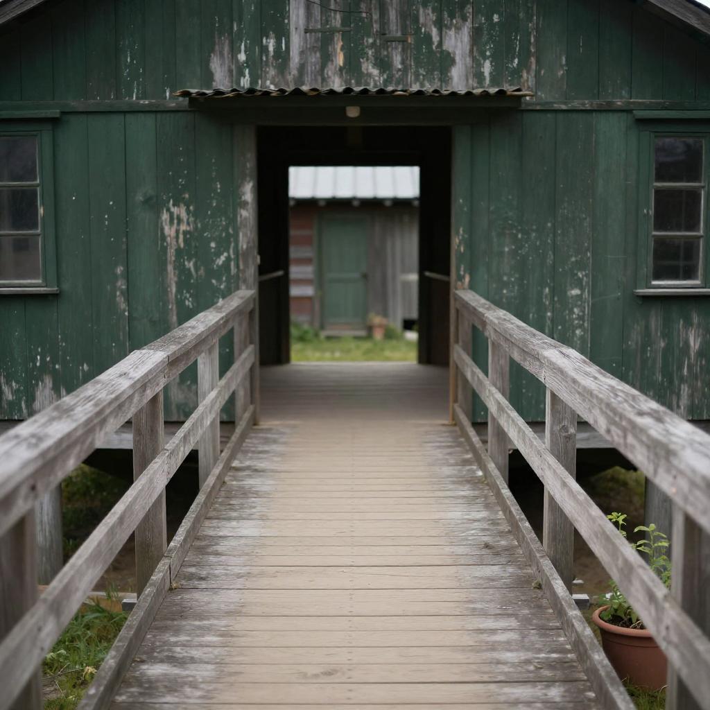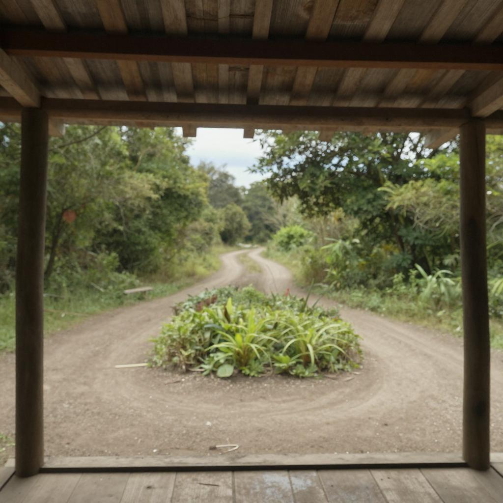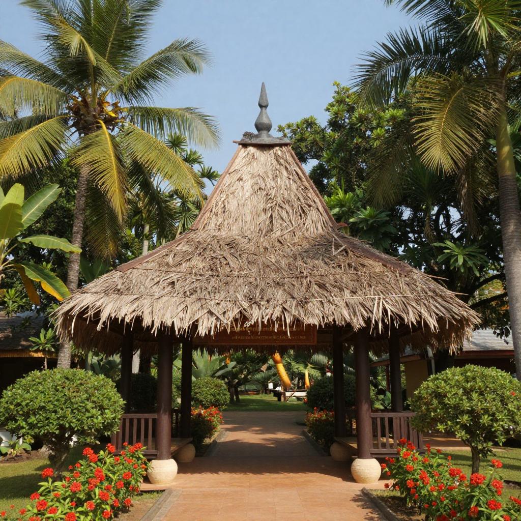 Photograph of a rustic, thatched-roof hut taken from a slight low angle. The hut has a wooden structure with two green shuttered windows. There are two wooden tables and chairs on the front porch. The grassy foreground is in sharp focus, while the background huts are slightly blurred. Natural daylight illuminates the scene evenly, with soft shadows. The depth of field is moderate, keeping the hut and immediate surroundings clear.