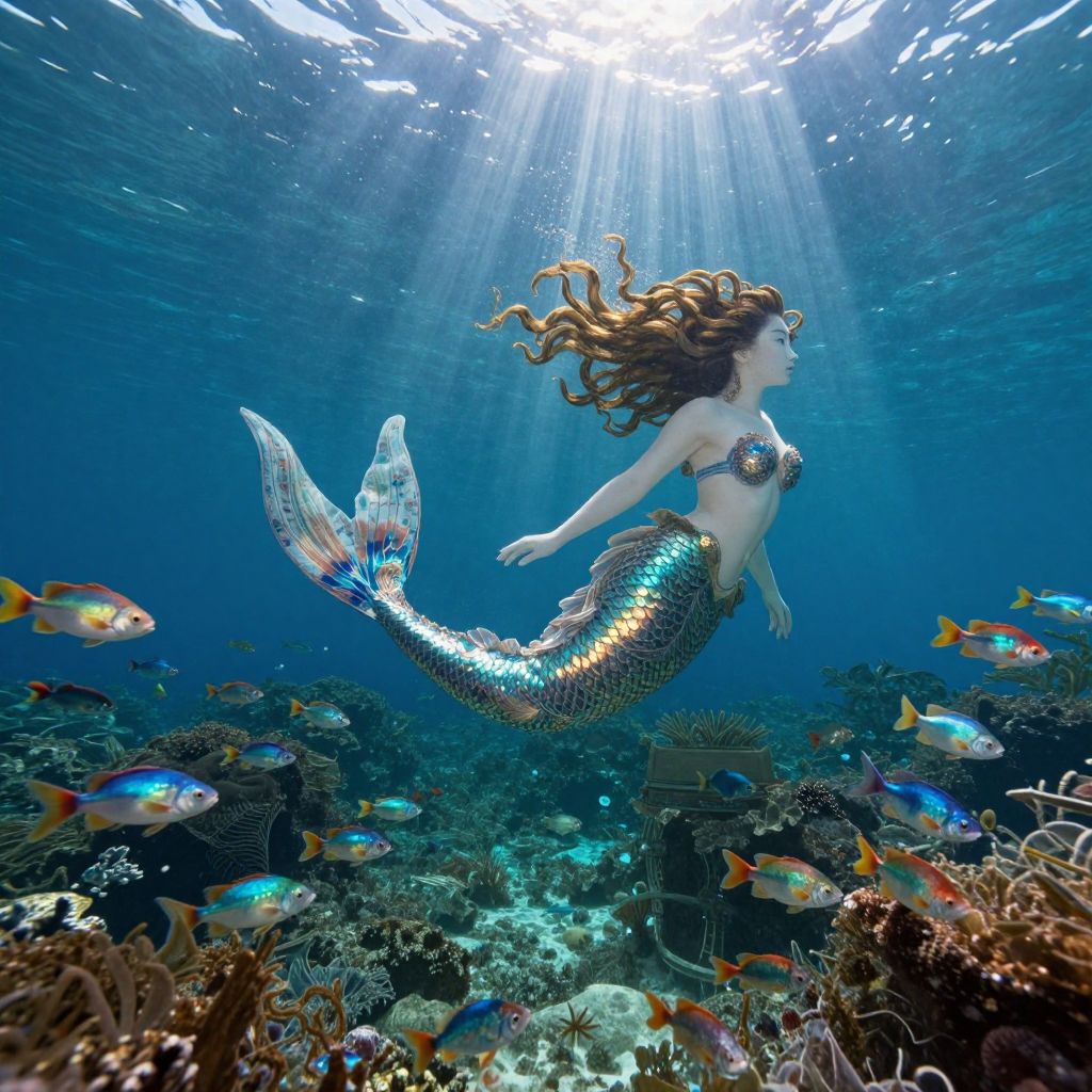 Envision an enchanting underwater landscape harmoniously blending Renaissance artistry with the intricate patterns of Japanese ukiyo-e woodblock prints. In this mesmerizing realm, a regal mermaid, her hair cascading like seaweed, elegantly sways amid a kaleidoscope of iridescent fish. Sunbeams pierce through the azure depths, casting playful shadows that accentuate their shimmering scales and her ethereal allure. Employing a wide-angle view amplifies the depth and majesty of this captivating aquatic domain, stirring a sense of awe and reverence for the enigmatic and entrancing world hidden beneath the waves.