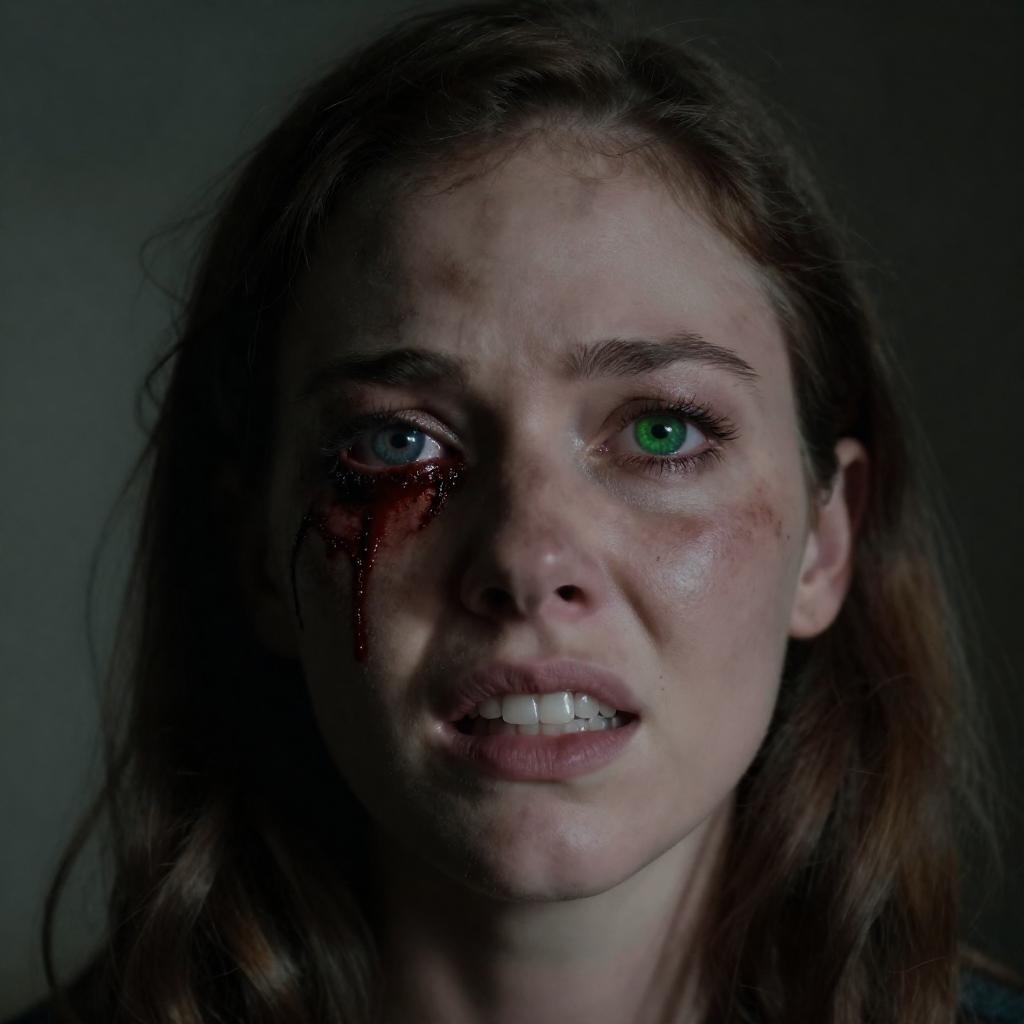 Close-up photograph of a blonde woman with blue eyes, light skin, and blood smeared across her right cheek and lips. She has a distressed expression, with furrowed eyebrows and slightly open mouth. Dark background.