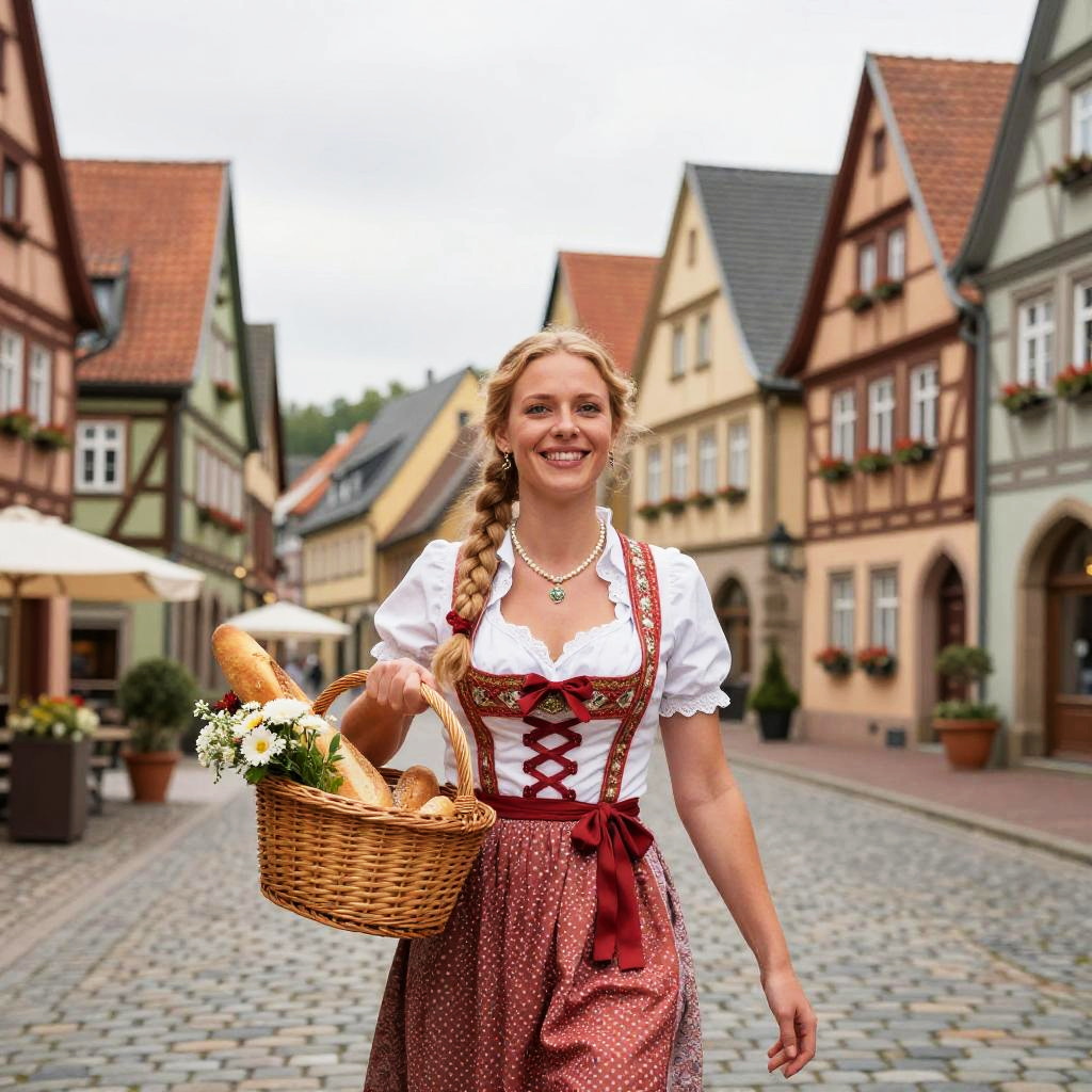 Stereotypical German woman wearing traditional dirndl dress, standing in a vibrant Bavarian village, colorful flowers all around, bright sunny day, smiling warmly