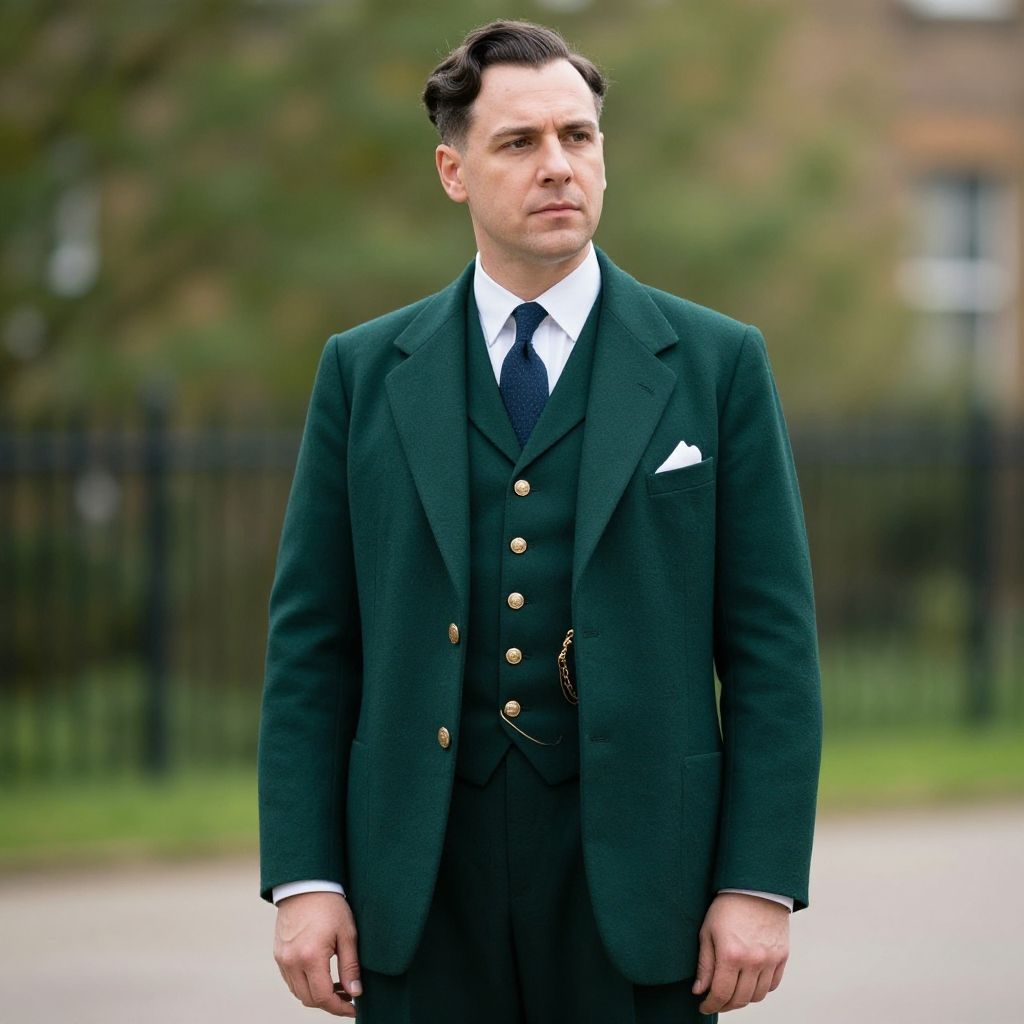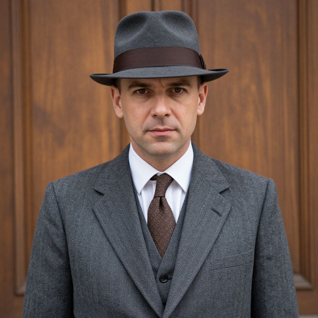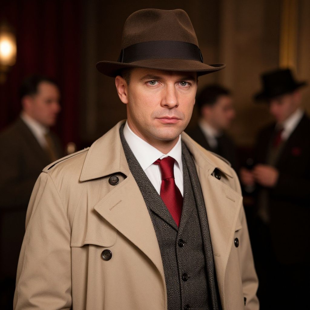 Portrait of a man wearing a brown fedora hat, beige trench coat, herringbone grey vest, white collared shirt, and red necktie. The background features a blurry vintage-style speakeasy setting with other men dressed in period attire, evoking the 1920s-1930s era.
