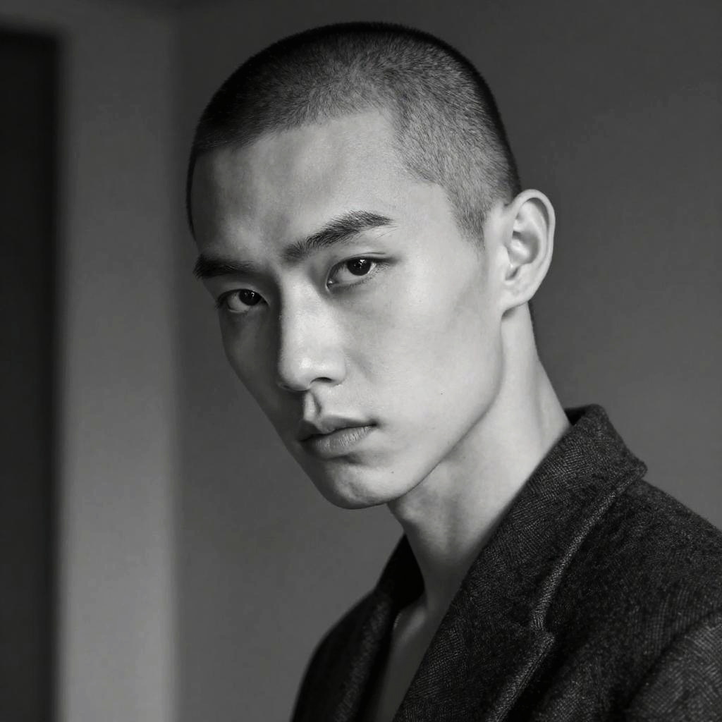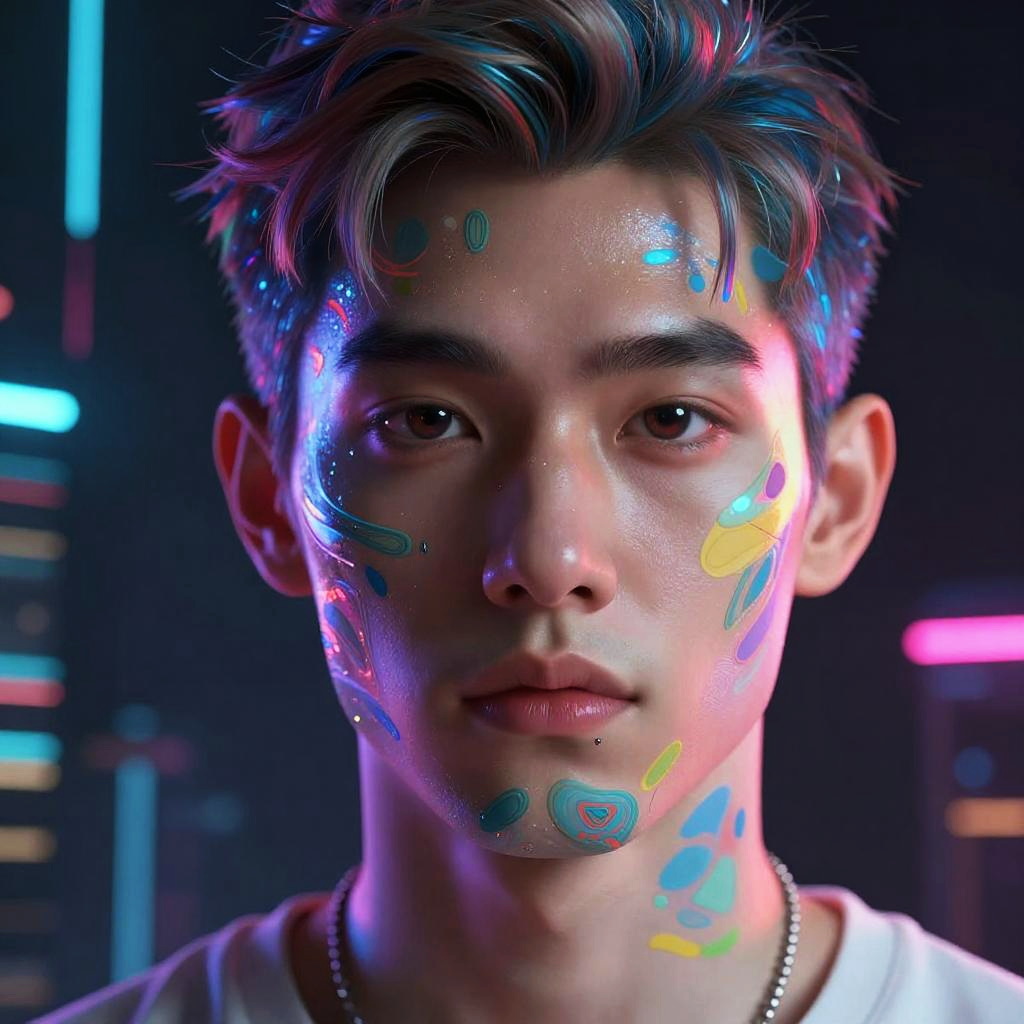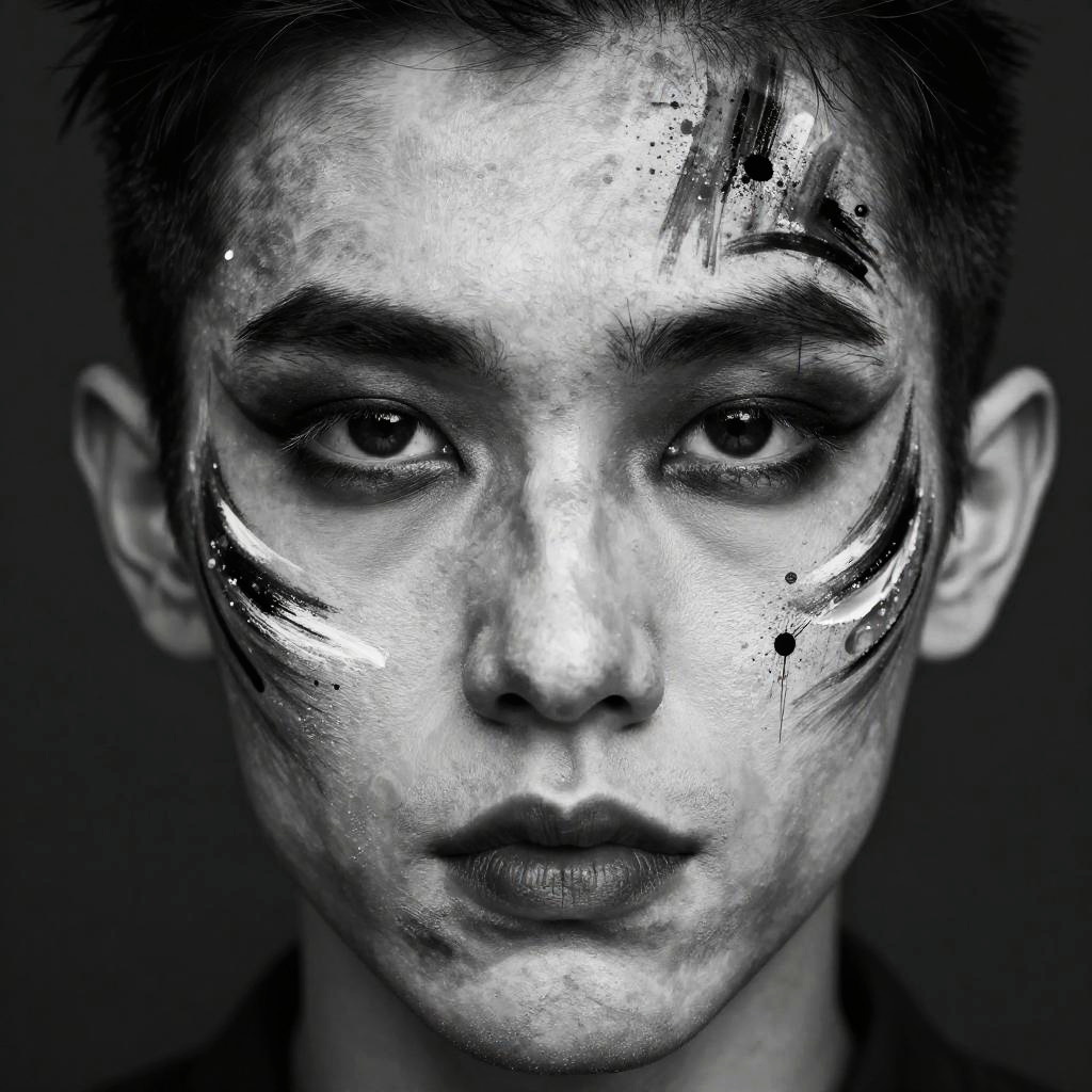Close-up portrait of a black and white face paint band member, intricate and bold face designs, intense gaze, textured skin details, dramatic shadows and highlights, monochrome aesthetic, abstract background with splashes of paint strokes, artistic and edgy mood.