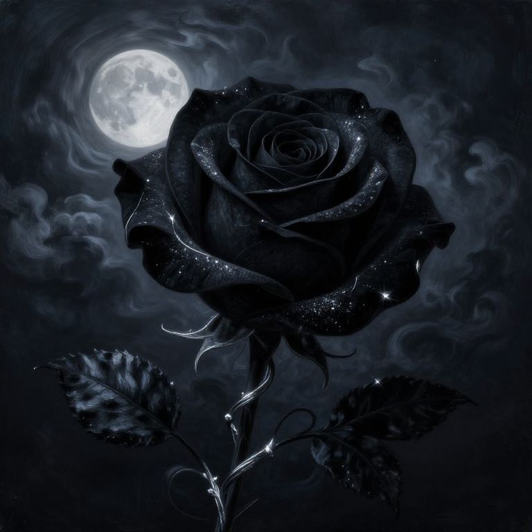 A digital illustration depicts a large, black rose with intricate, textured petals, glistening with sparkles, set against a dark, cloudy night sky. A bright, full moon shines in the upper left, illuminating the scene with a soft, blue-gray light. The rose's stem and leaves are dark and shadowy, with delicate, curling tendrils. The overall style is gothic and surreal, with a monochromatic blue and black color palette, creating a mysterious and ethereal atmosphere. The moon's glow highlights the rose's detailed textures and adds a sense of depth to the image.