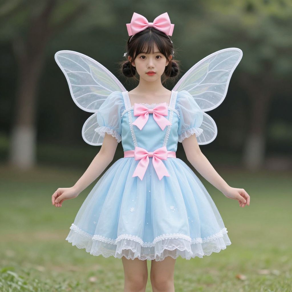 Fairy Costume Outfit, fairy in a blue dress with wings and a pink bow