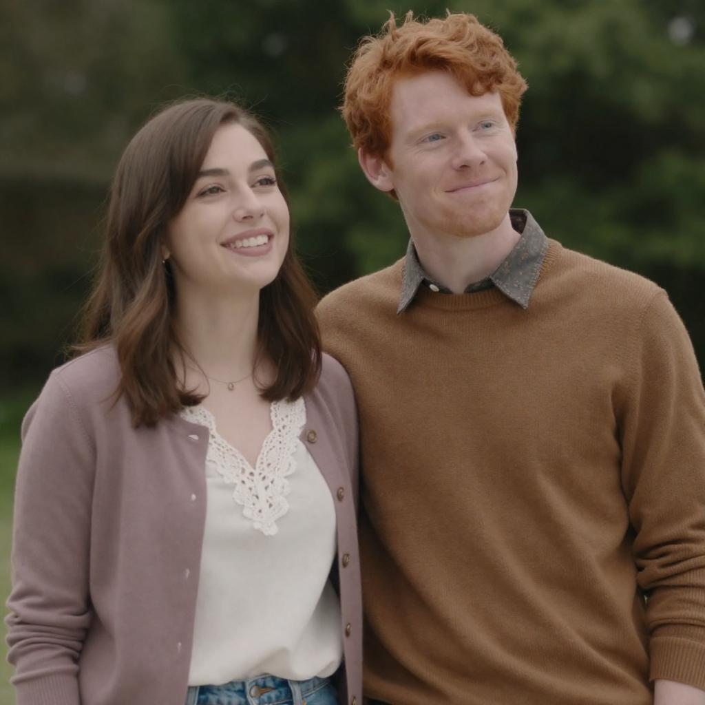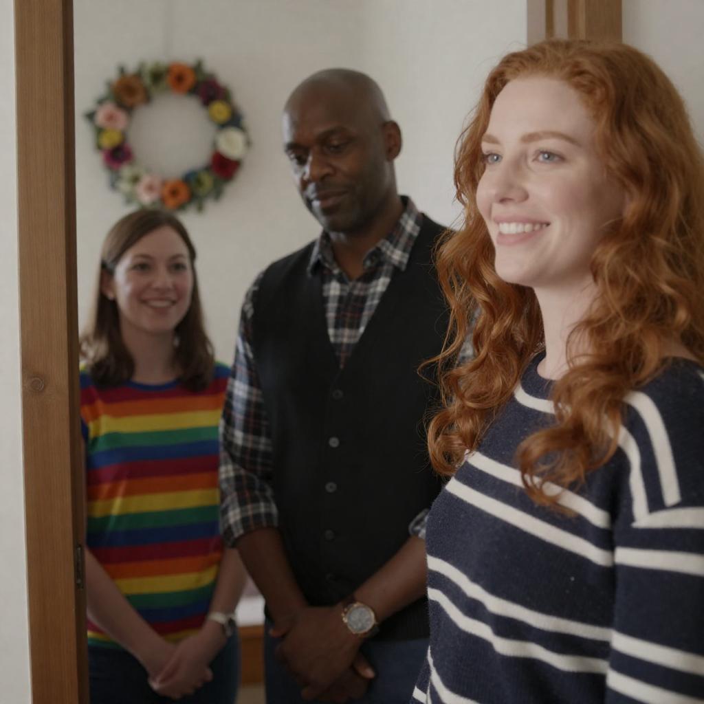 Photograph of three people. Redheaded woman with fair skin, smiling, in dark striped sweater, stands close to bald black man with medium skin, wearing plaid shirt and black vest, looking down. Woman in rainbow striped shirt stands in doorway, smiling. Floral wreaths on wall. Wooden door frame. Redheaded woman in foreground, man and woman in background.