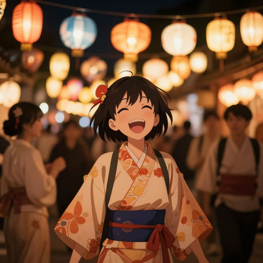 Anime girl laugh with friends at a festival, colorful lanterns glowing, traditional outfits, night scene with bokeh lights, energetic and happy vibe, intricate character details