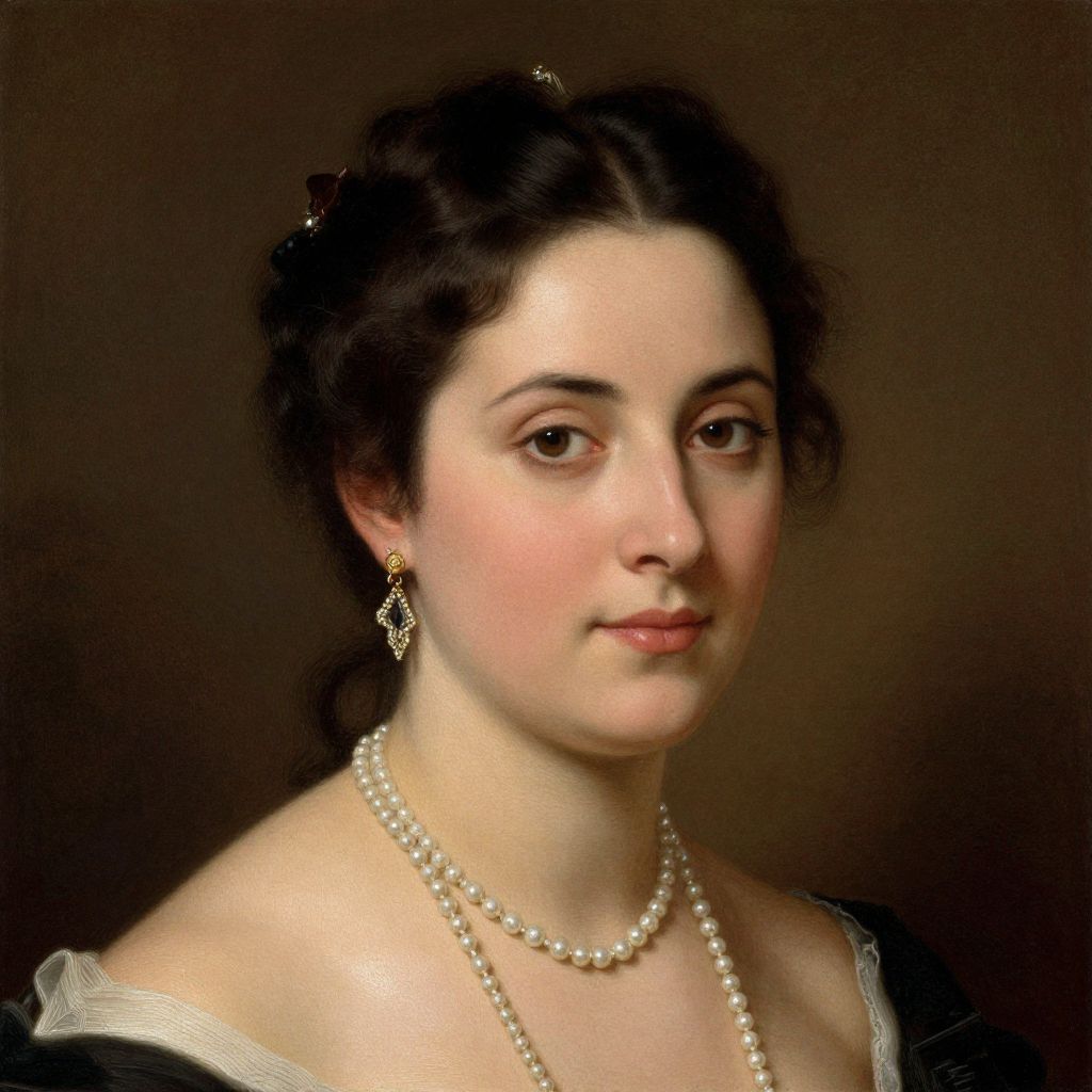 A classical portrait rendered in a high-definition, vintage style reminiscent of 19th-century realism, featuring a woman with dark, styled hair adorned with delicate earrings and a pearl necklace, set against a rich, textured background that evokes the timeless elegance of La Donna della Finestra (detail 1871).